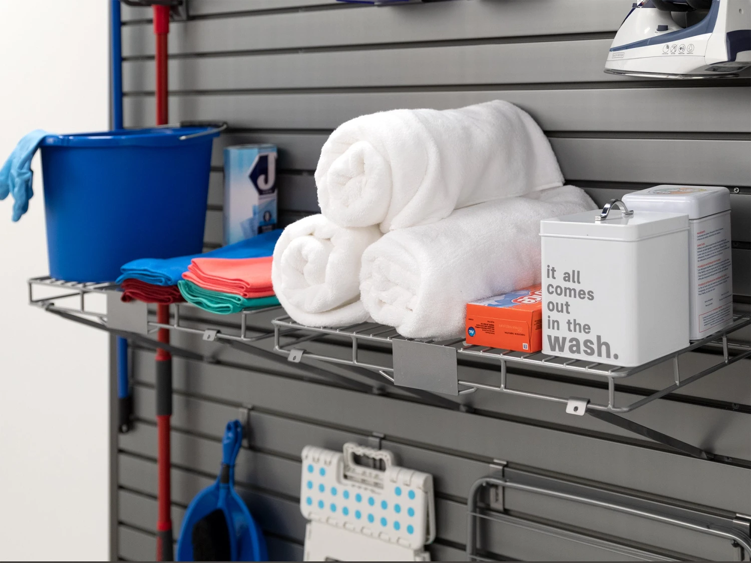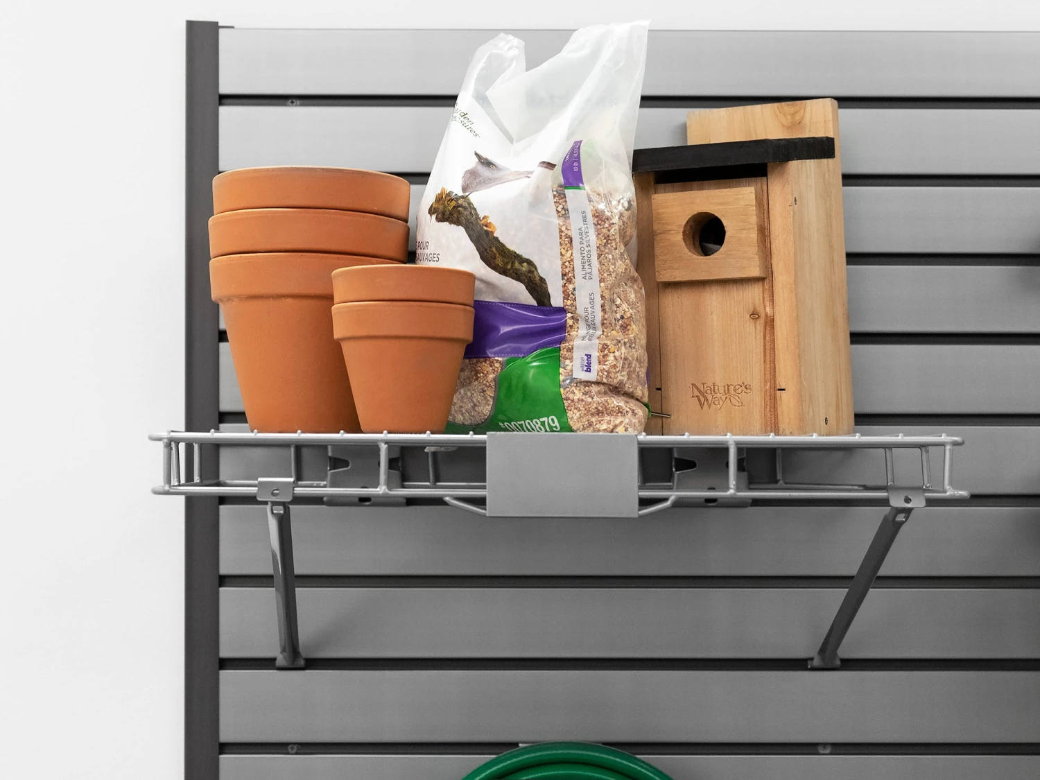 Maximize your slatwall system with NewAge Products Slatwall Accessories. Designed for use with NewAge Products Steel and PVC Slatwall systems, and compatible with most 3 in. on-center slatwall systems, our snap-in Slatwall Accessories are built with steel for extra strength. The powder-coat silver gloss finish looks great in any space and on both silver and black slatwall solutions. With a 30 lbs. weight capacity, the 2 ft. Wire Shelves are perfect for storing small gardening pots, buckets, and other household cleaning products.