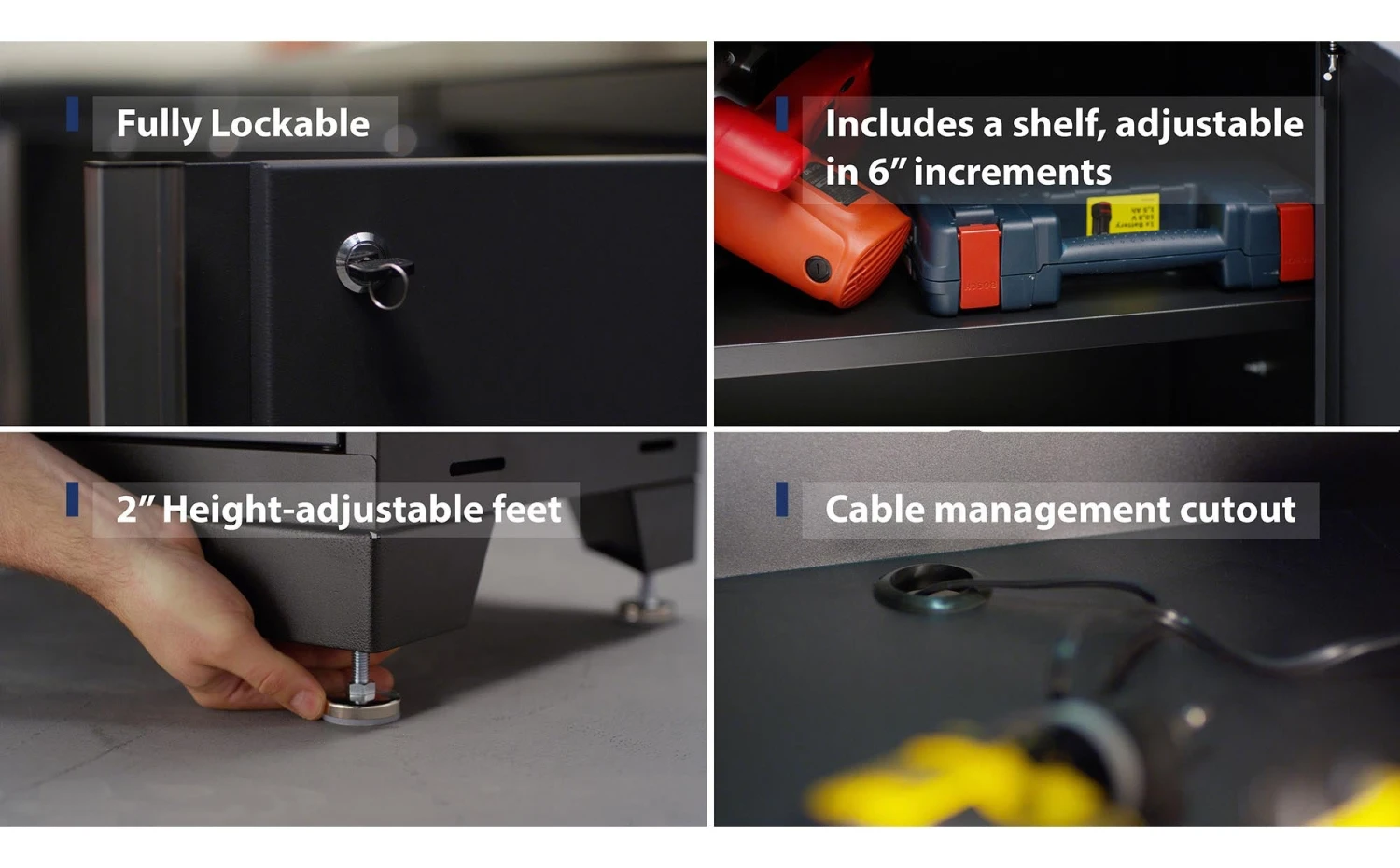 - Keep power tools charged using cable management access hole