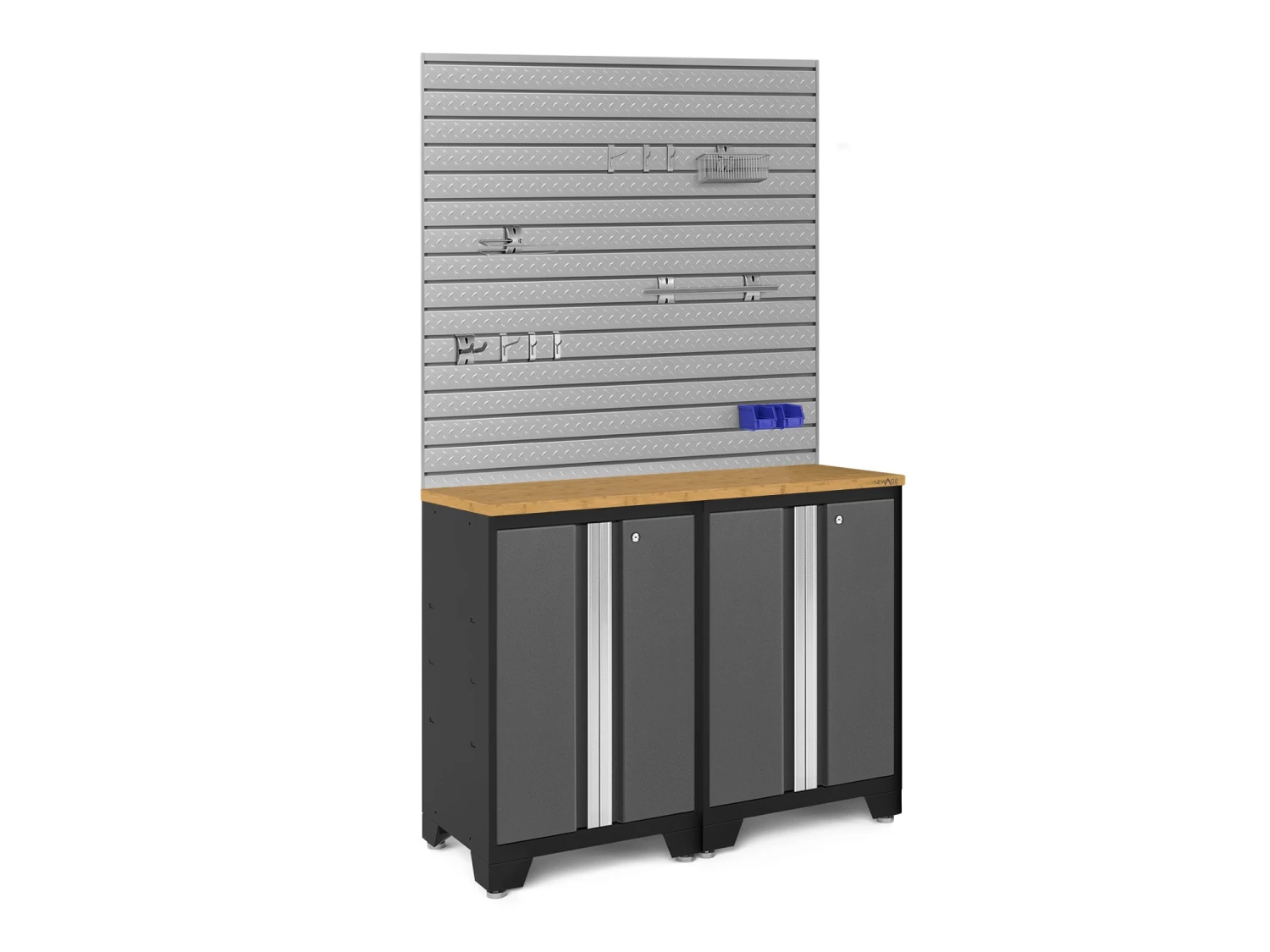 Upgrade the look and organization of your garage with Bold Series 3.0 Cabinetry. Built with heavy-duty steel frames for extra-strength, these cabinets are ideal for storing sports equipment, seasonal decor and tools. The powder-coat paint finish gives protection against scratches and rusting, making the cabinets perfect for rugged use. Full-length aluminum handles let you easily access your gear, with lockable doors to keep items secure. Full-extension drawers and adjustable shelves give you the customizable space to store items of all sizes. The diamond plate pattern Slatwall Kit includes two 2 ft. x 4 ft. panels that can be installed vertically for a stacked wall configuration, horizontally for a long length of tool storage, or on separate walls for area-specific organization. The Steel Slatwall Accessory Kit includes baskets, hooks, and utility components. Get organized and improve the functionality of your garage, with a Bold Series 3.0 Cabinet System.