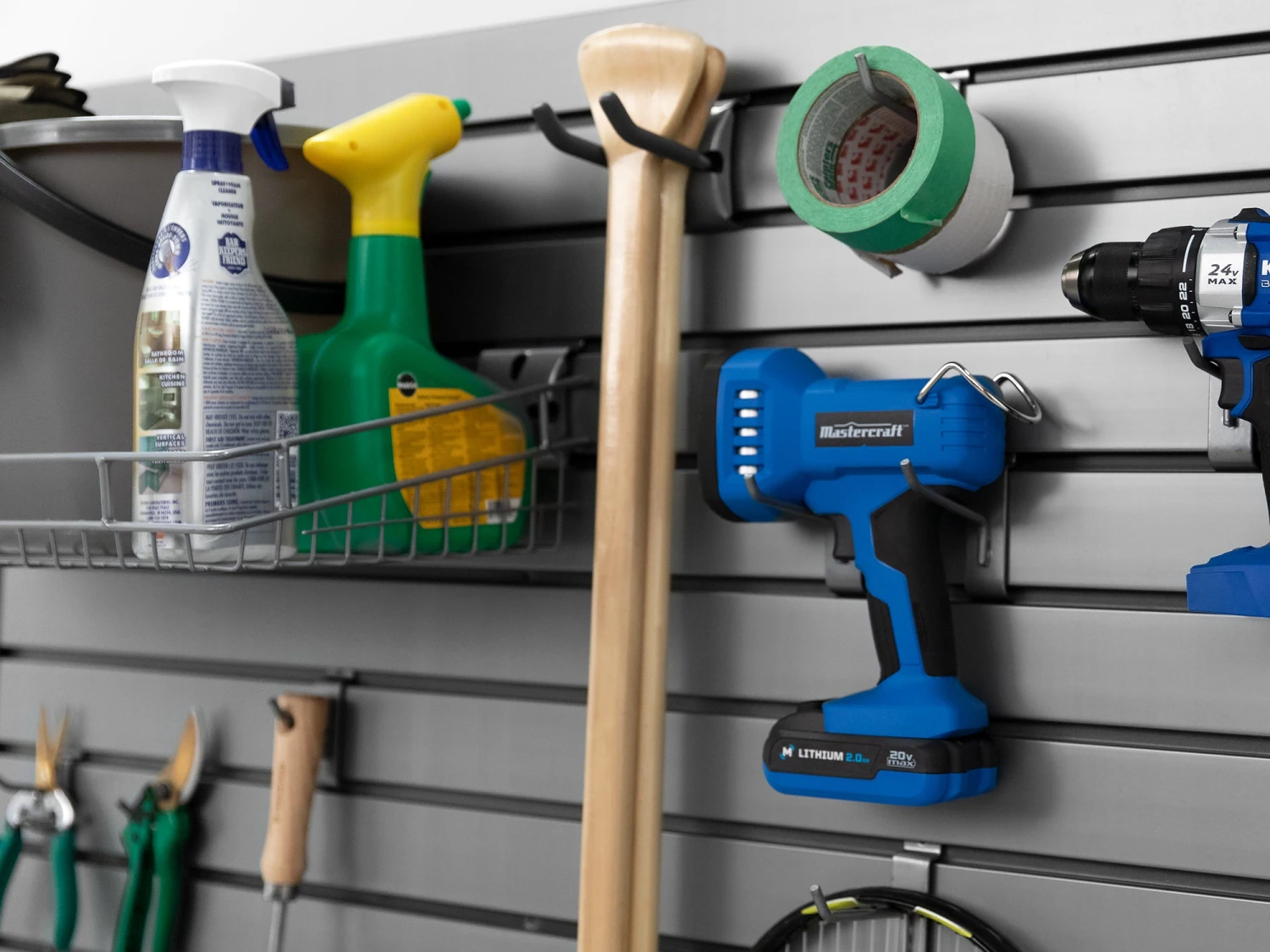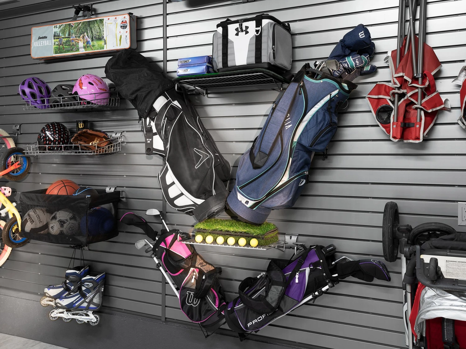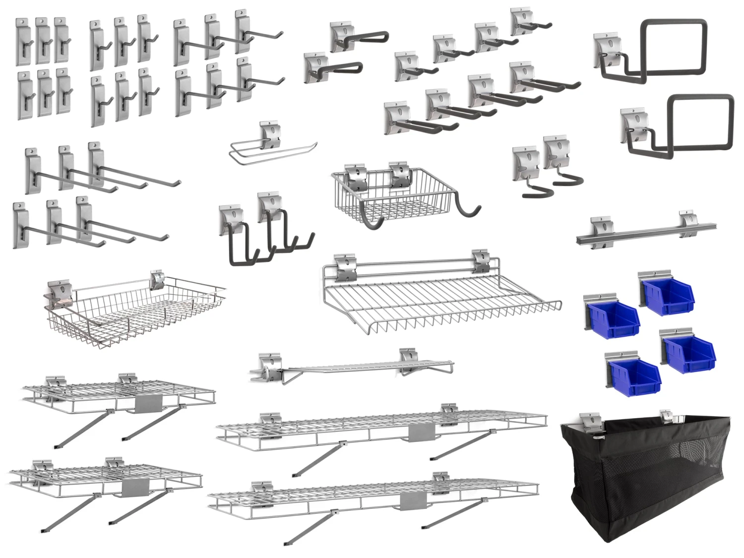 Maximize your full-wall Slatwall Solution with every hook, basket, shelf and specialty slatwall accessory that NewAge Products has to offer. Designed for use with the NewAge Products Steel Slatwall and PVC Slatwall options, and compatible with most 3 in. on-center slatwall systems, the NewAge Products All-in Slatwall Accessory Kit is most perfectly suited for a full-wall slatwall solution and includes everything you need for storing all your gear. The extra strong steel hooks keep your smaller items like hand tools and gardening forks organized, while the Double Hooks are perfect for getting rakes and shovels off the ground. Shelves and Baskets provide ample storage space for cleaning supplies and other items like small coolers and buckets. Store extension cords and hoses on the Loop Hooks and Deep Utility Hooks. The J Hooks are ideal for holding chainsaws, leaf blowers, trimmers, and other large bulky items. The Vertical Bike Hooks make it easy to wall hang your bicycles, for a cleared floor space, while the Shallow Basket with Bike Hook allows you to store your bike horizontally and provides a built-in shelf for storing bike helmets. The Golf Hook and Shelf provides hanging storage for 2 golf bags, and a shelf to store other gear like golf balls and small coolers. The Magnetic Tool Bar provides a unique solution for organizing your often-used hand tools. The Paper Towel Holder lets you tear sheets one-handed for quick tidying. The Angled Shoe Rack gives you the perfect place to store your rain boots, work boots, and other outdoor shoes. The Blue Parts Bin are great for storing quick grab items like hardware and other small parts. Included in the kit are Parts Bins Support brackets for use on PVC Slatwall. Built with steel for extra strength, and a powder-coat silver gloss finish that looks great in any space, the All-in Slatwall Accessory Kit turns your space into the storage and organization hub of your dreams.