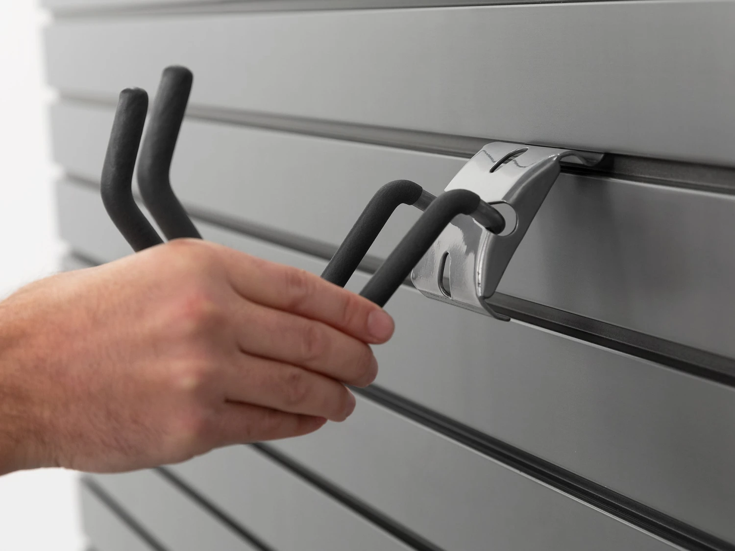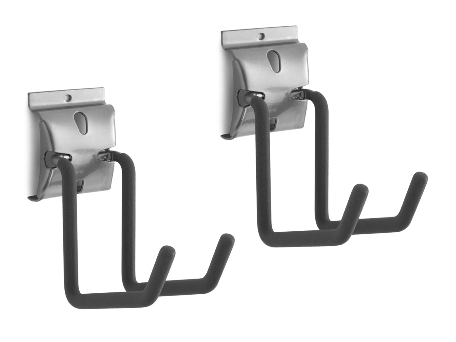 Maximize your slatwall system with NewAge Products Slatwall Accessories. Designed for use with NewAge Products Steel and PVC Slatwall systems, and compatible with most 3 in. on-center slatwall systems, our snap-in Slatwall Accessories are built with steel for extra strength. The powder-coat silver gloss finish looks great in any space and on both silver and black slatwall solutions. The J Hooks feature a protective rubber sleeve that helps prevent sliding and damage to chainsaws, leaf blowers, trimmers, and other large bulky items.