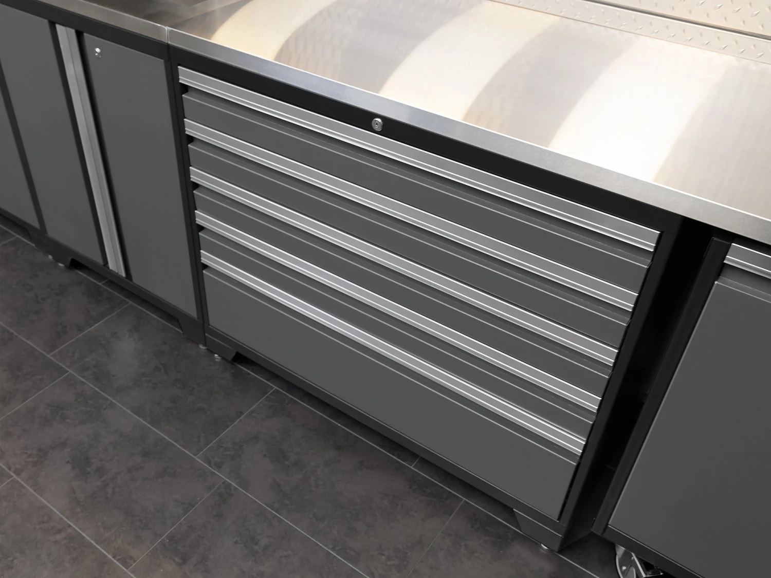 It’s time to ditch the rookie toolbox, and step up to the tool storage reserved for the Pros. The NewAge Products Pro Series 42 in. Tool Cabinet give you a massive amount of organized drawer space for storing power tools, plumbing supplies, electrical gear, painting and finishing equipment, and anything else you’ve got tucked away in every corner of your workspace. Built with heavy-gauge welded steel frames, and 5 huge full-extension drawers, this behemoth easily holds up to 1,000 lbs. of weight in a convenient storage solution that will keep you wondering how you ever lived without it. The premium soft-close drawer slides allow each drawer to glide smoothly open and closed, even under maximum weight, while the single locking mechanism allows you to quickly and easily secure your belongings. Included custom fit foam drawer liners protect your tools and prevent them from sliding around, while the slot-in steel drawer dividers give you more customization over how you separate your hardware and smaller items. The ultra-durable paint finish protects your Tool Drawer from scratches and dings from wayward hand tools, and keeps it looking like new. Installed on the floor, off the floor, on casters, or in a set, the Pro Series 42 in. Tool Drawer is the only tool storage that lets you work like a Pro.