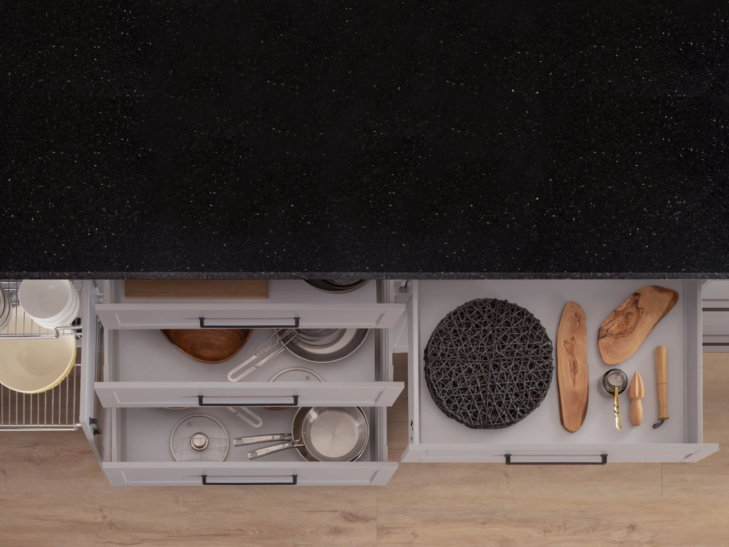 Available in a range of lengths, as well as three beautiful finishes, our granite countertops bring life-long style to your kitchen. Low maintenance but infinitely stylish, these are the final flourish when it comes to your dream kitchen. Choose from three stunning finishes; Pearl White, Black Galaxy or Gold Sand to complement the rest of your cabinetry. Our standard length matches the width of the cabinet exactly, while the extended length creates an overhang of 20mm on both sides to allow for the installation of side panels.