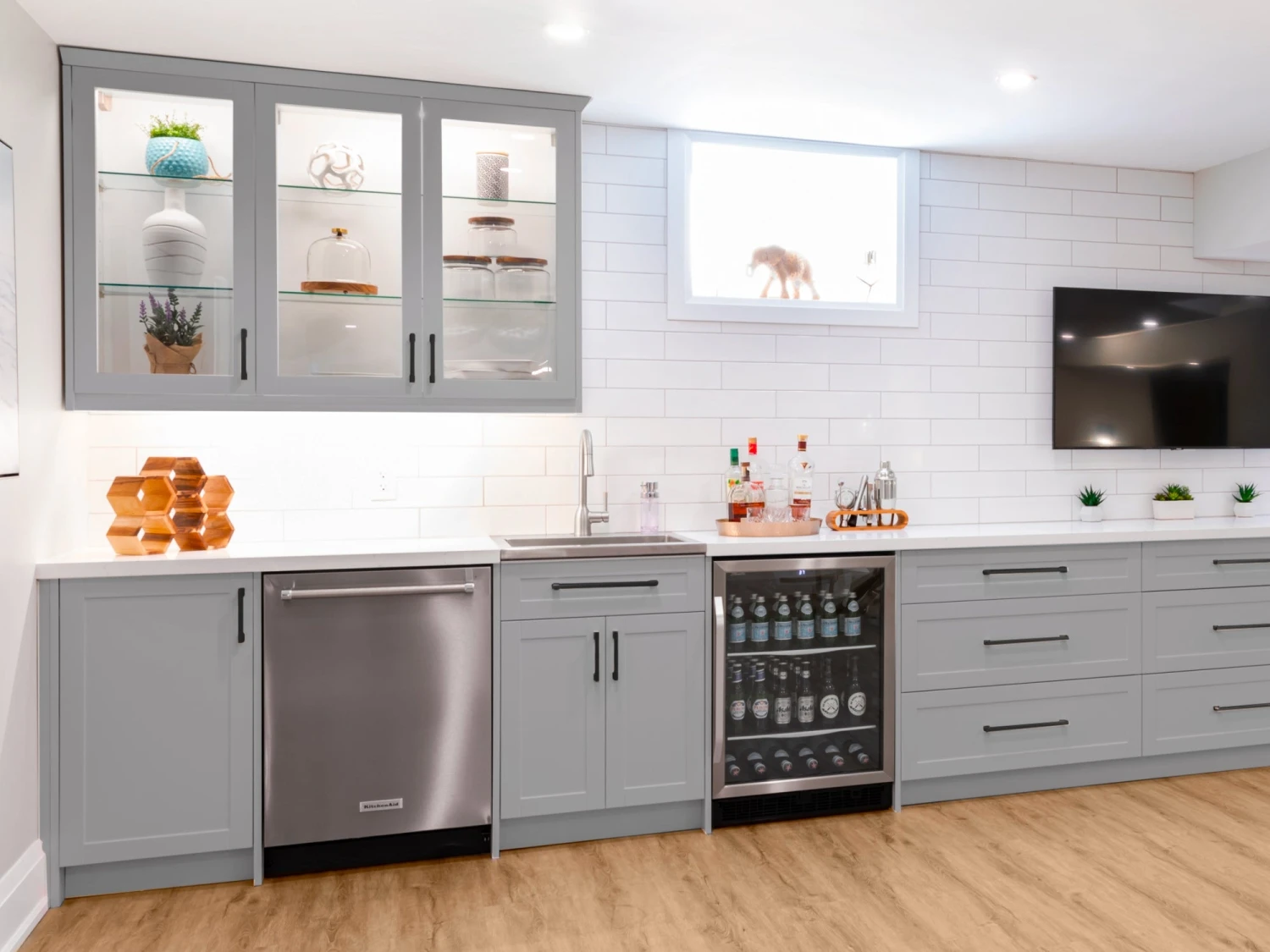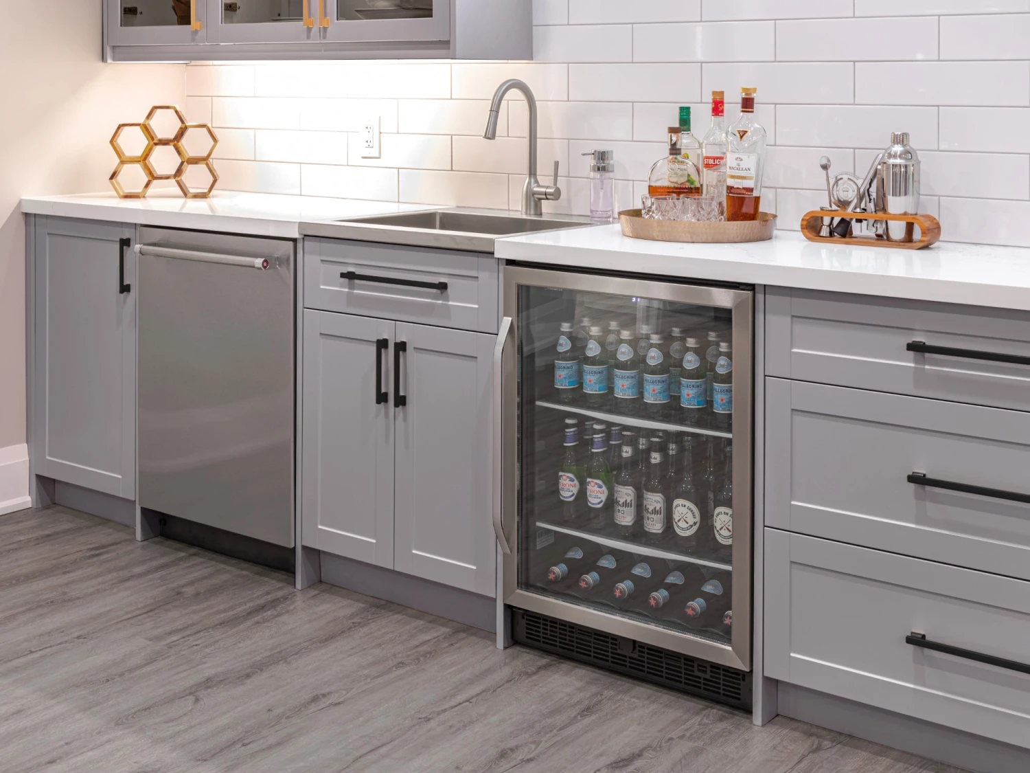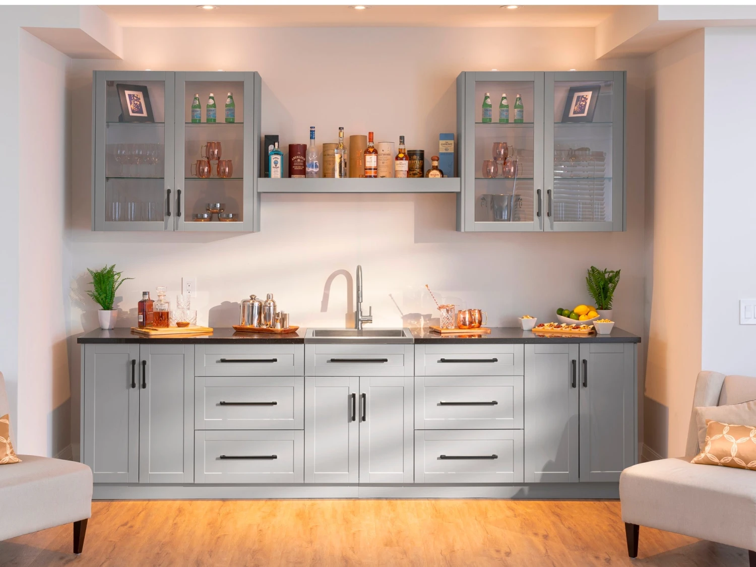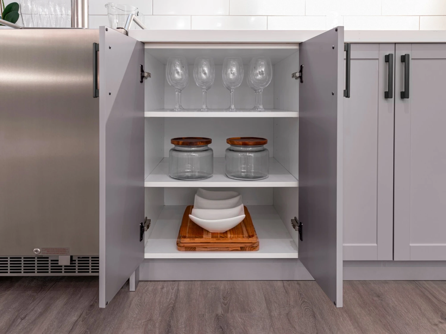 Entertain with flair and enjoy stylish, versatile function in any room with a modular 24 in. home bar cabinet set. Each fully assembled set provides convenient storage in a sleek, space-saving profile. Customize with your choice of granite countertops, handles and premium trim. It is the perfect place to keep serving sets, placemats, tablecloths, and decorations along with glassware and other entertaining essentials. Full-extension drawers feature premium, soft-close hinges. Thick 18mm frame construction delivers outstanding durability beneath an easy-clean surface. Available in your choice of white or grey matte finishes to complement any décor. Cabinet organization and accessories are sold separately.