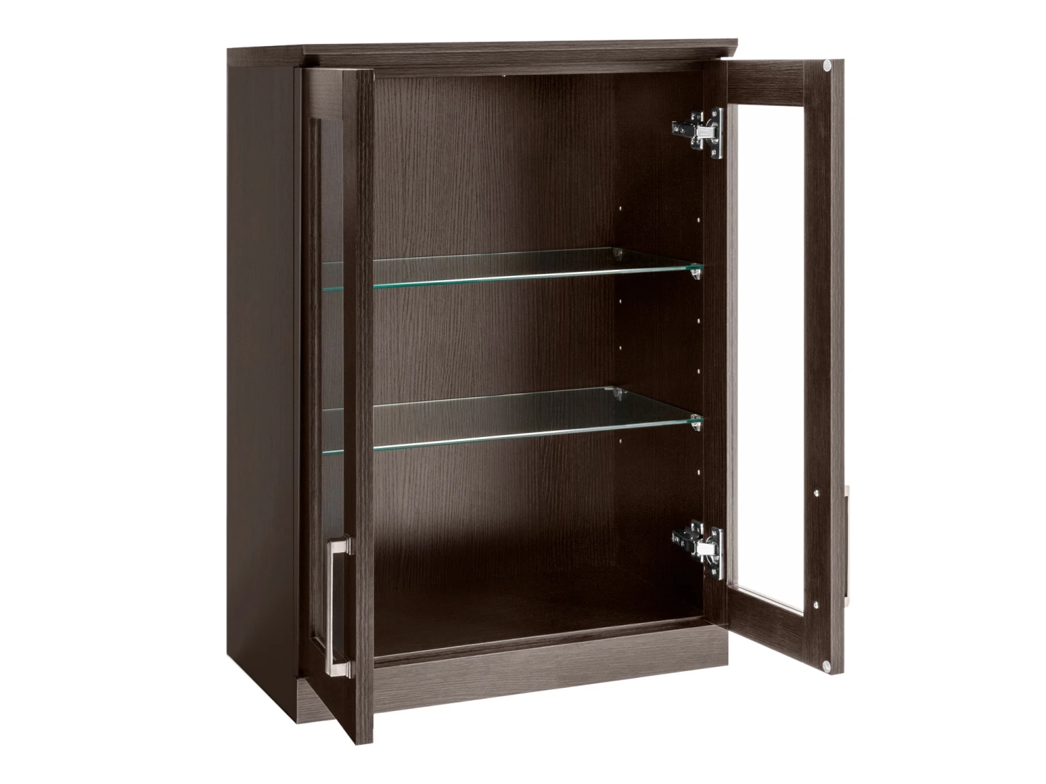 Maximize your counter space by getting things up and into the Home Bar Series 21 in. Short Wall Display Cabinet . Impact-tested glass doors add dimension to the cabinet and highlight the items on display. Sleek shaker style doors with soft-close hinges prevent slamming and protect valuable contents. A solid plywood core supports 2 adjustable tempered glass shelves providing a versatile display space for espresso tools, cookbooks and heirlooms. The Home Bar Series 21 in. cabinetry is available in a variety of colors to suit any room in your home with a stain-resistant melamine finish to protect from scratches and spills. Nickel-plated handles feature subtle details that accent the classic shaker-style doors and drawers. Store your stemware and collectables in style, with the Home Bar Series 21 in. Short Wall Display Cabinet.