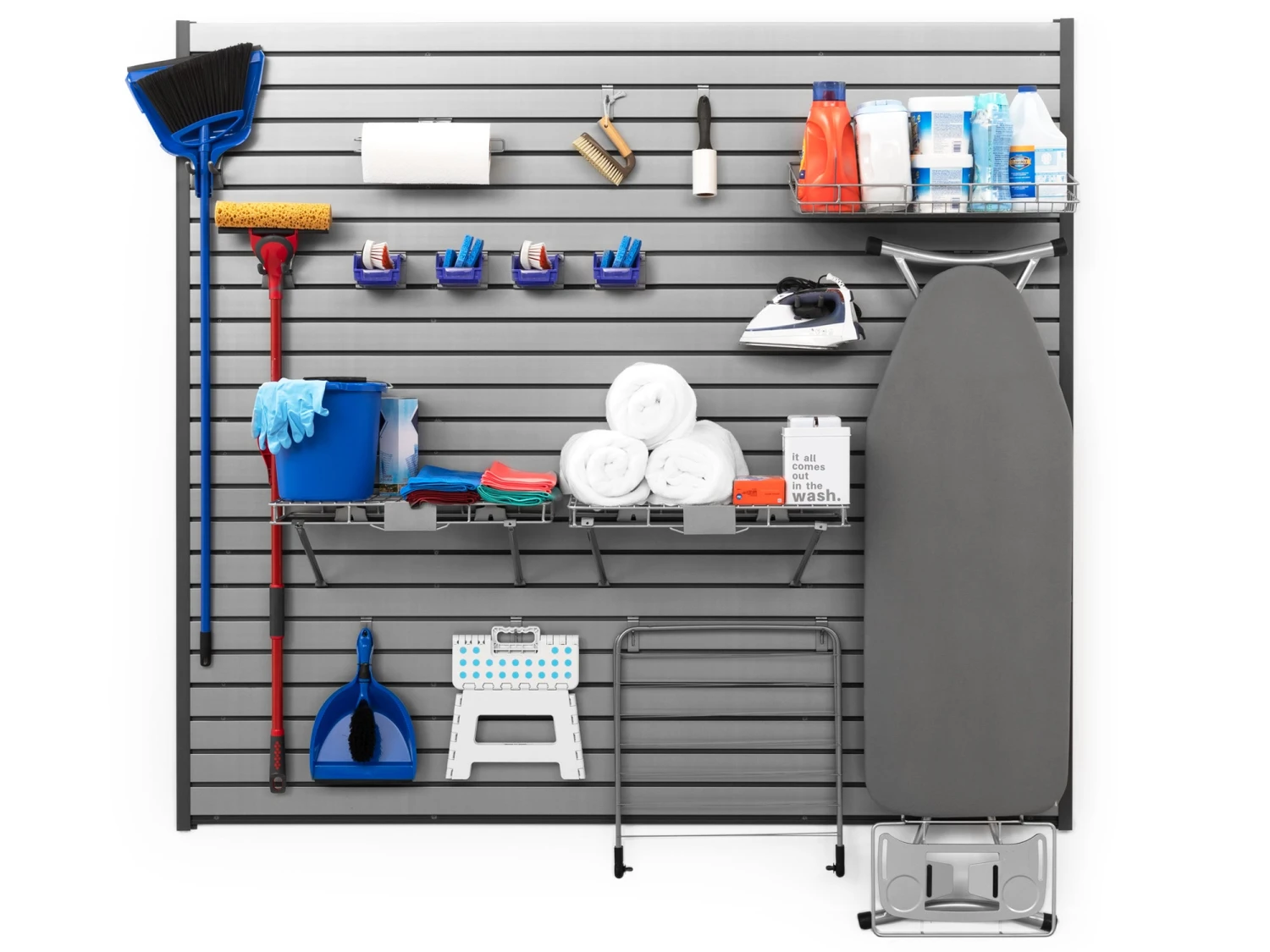 Organize all your household items on your slatwall solution with a variety of hooks, baskets, shelves, and other specialty accessories. Designed for use with the NewAge Products Steel Slatwall and PVC Slatwall options, and compatible with most 3 in. on-center slatwall systems, the NewAge Products Home and Laundry Slatwall Accessory Kit includes everything you need for storing cleaning supplies, detergent, ironing boards, and other household items. The extra strong steel hooks keep your smaller items like dust bins, and scissors efficiently organized, while the Double Hooks are perfect for getting mops, brooms, and ironing boards off the ground. With a lip to prevent your items from falling off, the Shallow Basket is ideal for storing cleaning supplies and laundry detergent. With a 30 lbs. weight capacity, the 2 ft. Wire Shelves provide storage for buckets, rags, and bins. The Blue Parts Bin are great for storing small quick grab items like clothes pins and sponges. Included in the kit are Parts Bins Support brackets for use on PVC Slatwall. The Paper Towel Holder lets you tear sheets one-handed for quick tidying. The Home and Laundry Slatwall Accessory Kit turns any slatwall system into the perfect storage hub for all your household supplies.