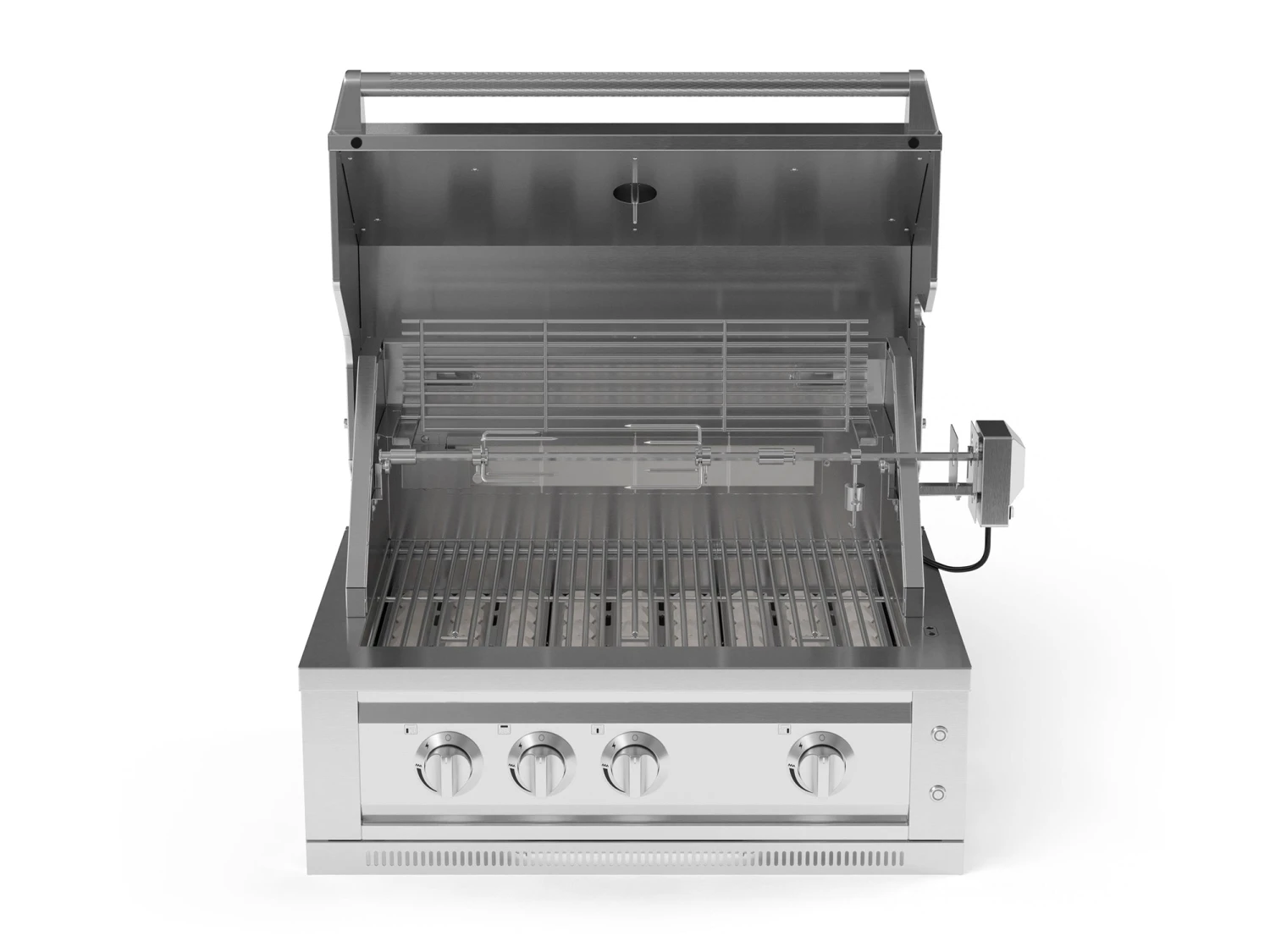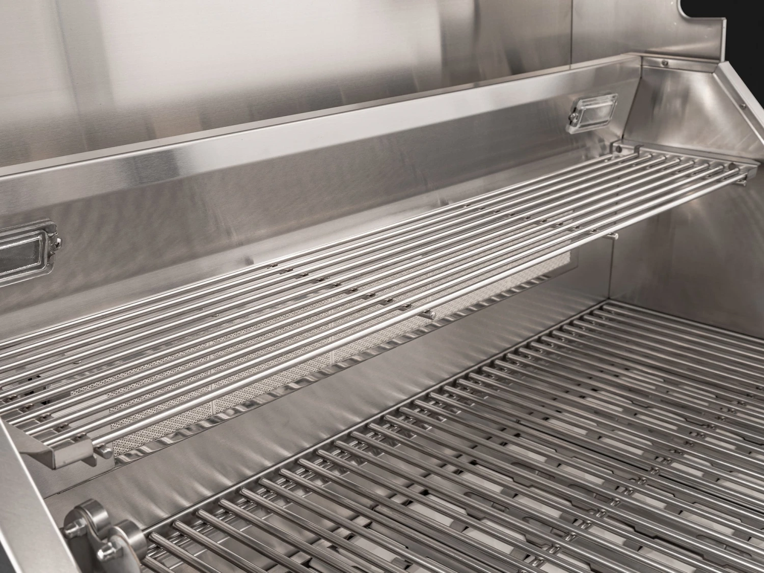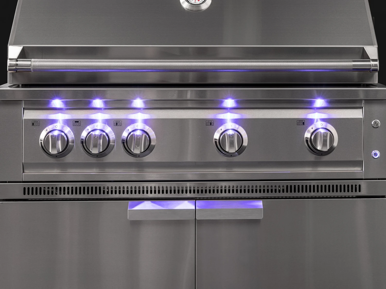 The NewAge Platinum Grill offers up to 850 square inches of cooking space with high-end features that let you cook with confidence and precision. Crafted from premium 304 stainless steel, each member of our Platinum Grill Series has a full-length handle with a sturdy, dual layered hood that locks in heat from the 3 high-performance burners. Seal in juices with the searing heat of a powerful infrared sear burner. Slow cook to perfection with the precision control of a wide, powerful rotisserie burner and easy-to-read temperature gauge. And there’s plenty of room to toast buns on the elevated warming rack. Flame thrower direct-pilot ignition gets things fired up quickly, while LED accent control knobs and heat-protected interior lights take the guesswork out of night-time grilling. Four heavy-duty wheels (two lockable) let you move your grill away from an entertaining area, keeping everyone comfortable, or get it up close to the action for convenient access to your tasty creations. And of course, the mobility of a cart lets you store your grill out of sight. The built-in pulse ignitor for NewAge Dual Side Burner ensures quick and effortless start-up, every time, while precision-control knobs make it easy to accurately adjust your heat settings Protect your burners when not in use and gain additional prep space with the fold-down flush-mount lid. The included cabinet integrates seamlessly with NewAge Grill Cabinets so you can create a complete mobile grilling station.