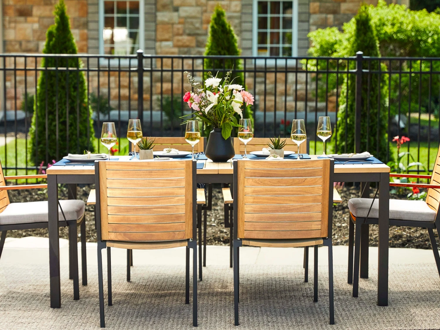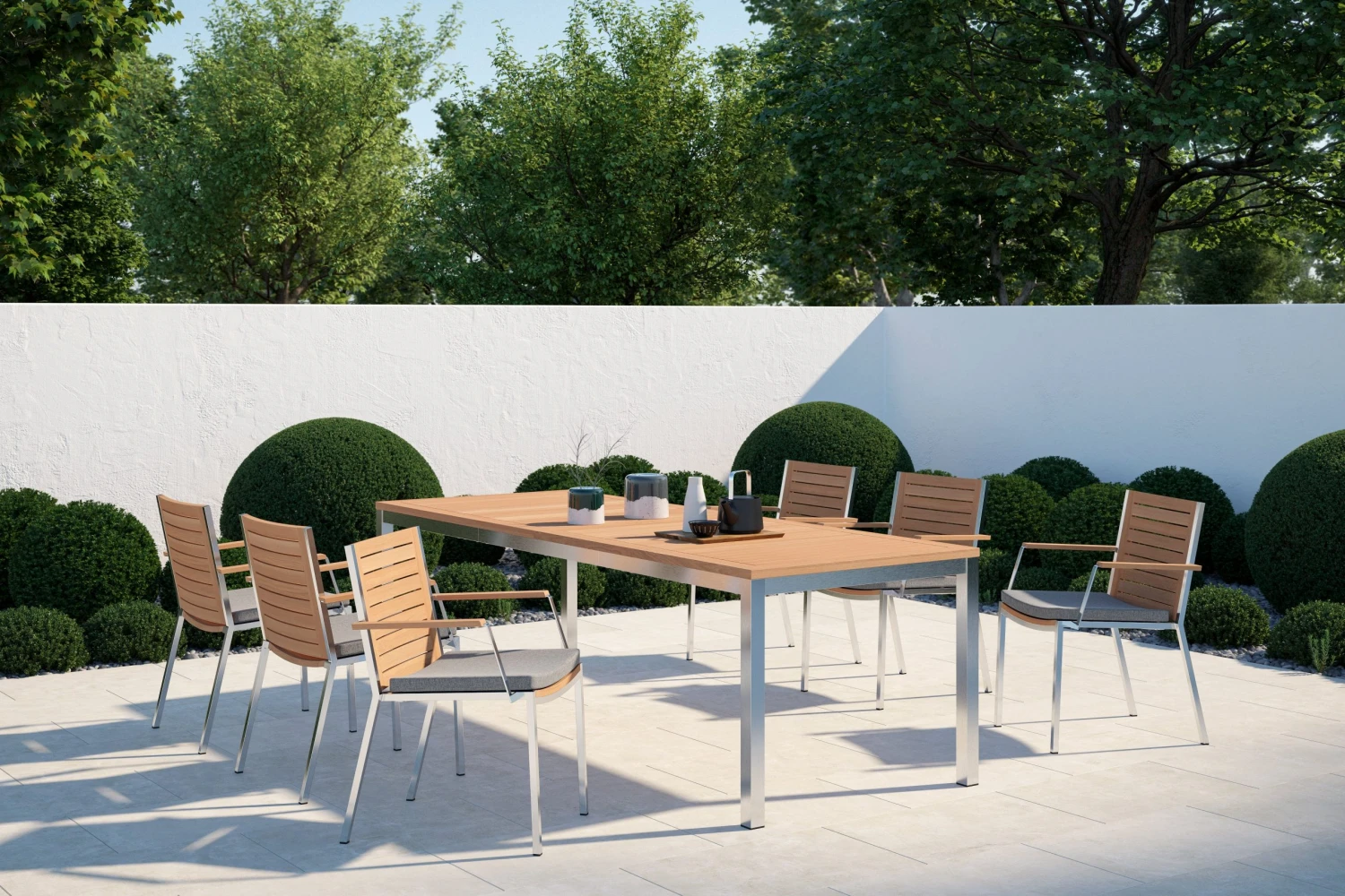 - Contemporary slatted tabletop crafted in premium natural teak