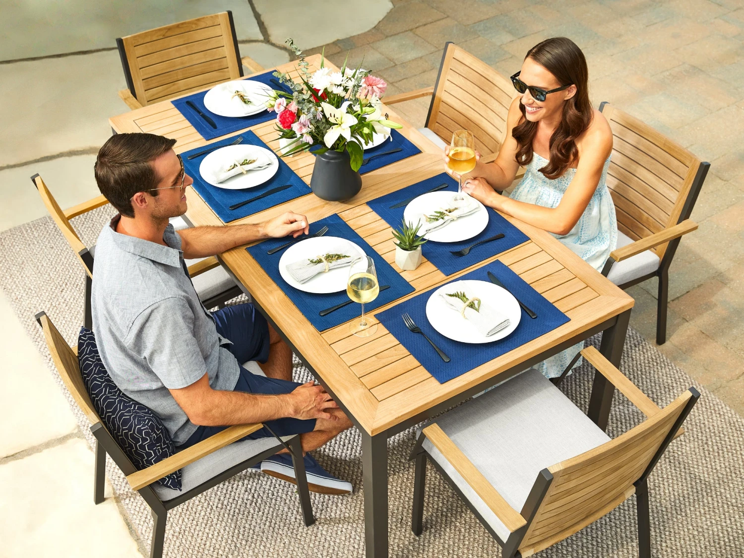 The NewAge Products teak Dining Table exudes a contemporary elegance and welcoming warmth, sure to be an entertaining centerpiece that family and friends will gravitate to. The spacious tabletop is constructed from premium natural teak with a modern, slatted design, creating a beautiful surface that complements our Monterey, Rhodes and Lakeside dining chairs while adding natural beauty and warmth to any backyard space. The elegant teak tabletop is supported by a sleek, yet robust frame and legs, meticulously crafted in your choice of bright stainless steel or the dusky contrast of powder coated aluminum. Available in 72â and 96â lengths, NewAge Outdoor Dining Tablesâ 2-piece top assembly allows for a quick and simple set up, and the removable teak center plug provides easy placement of our premium patio umbrellas.
