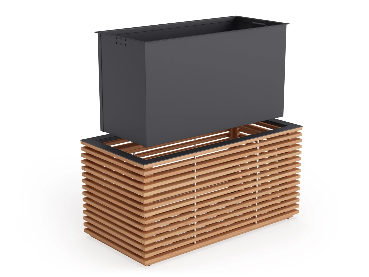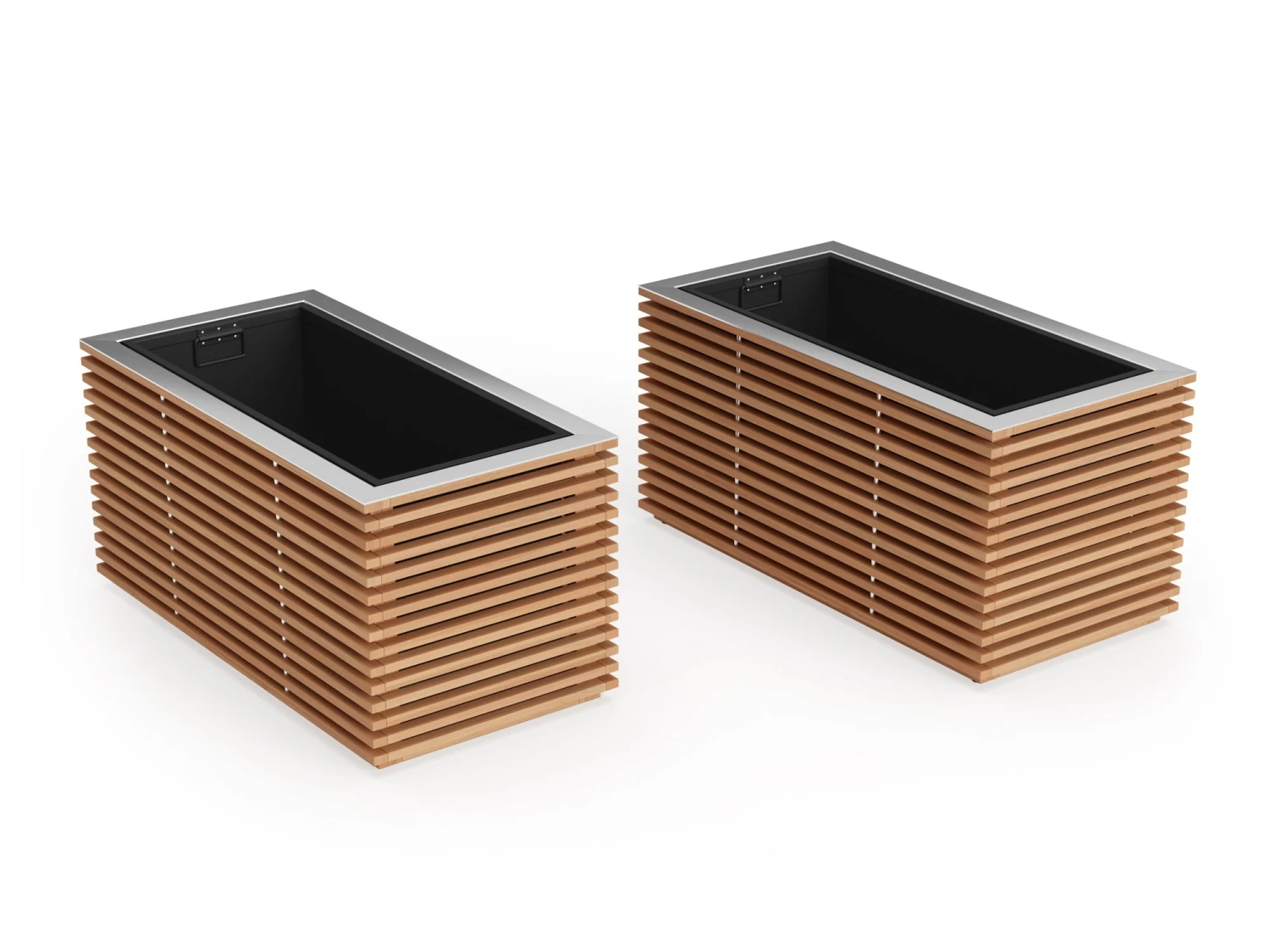 Dress up your backyard oasis with accents of natural greenery in sophisticated Monterey Collection planters. Available in square or rectangular designs, the full slatted exterior casing is crafted of premium natural teak for years of weather-resistant beauty. Elegant top accent pieces in stainless steel or powder coated aluminum coordinate with seating materials. Our versatile planters can also be used as ice buckets. Simply line the empty insert bin with plastic, fill with ice and let the festivities begin. The aluminum insert bin is lightweight and corrosion resistant, ideal for wet outdoor conditions and easy to keep clean. Integrated hidden handles let you easily remove and transport the bin for planting or relocating. Our modern teak planters are an ideal way to add the beauty of plants anywhere in your outdoor space. Decorative and versatile, our planters quickly convert to fashionable ice buckets. Simply line the insert bin with plastic, fill with ice and let the festivities begin. Decorative and versatile, our planters quickly convert to fashionable ice buckets. Simply line the insert bin with plastic, fill with ice and let the festivities begin.