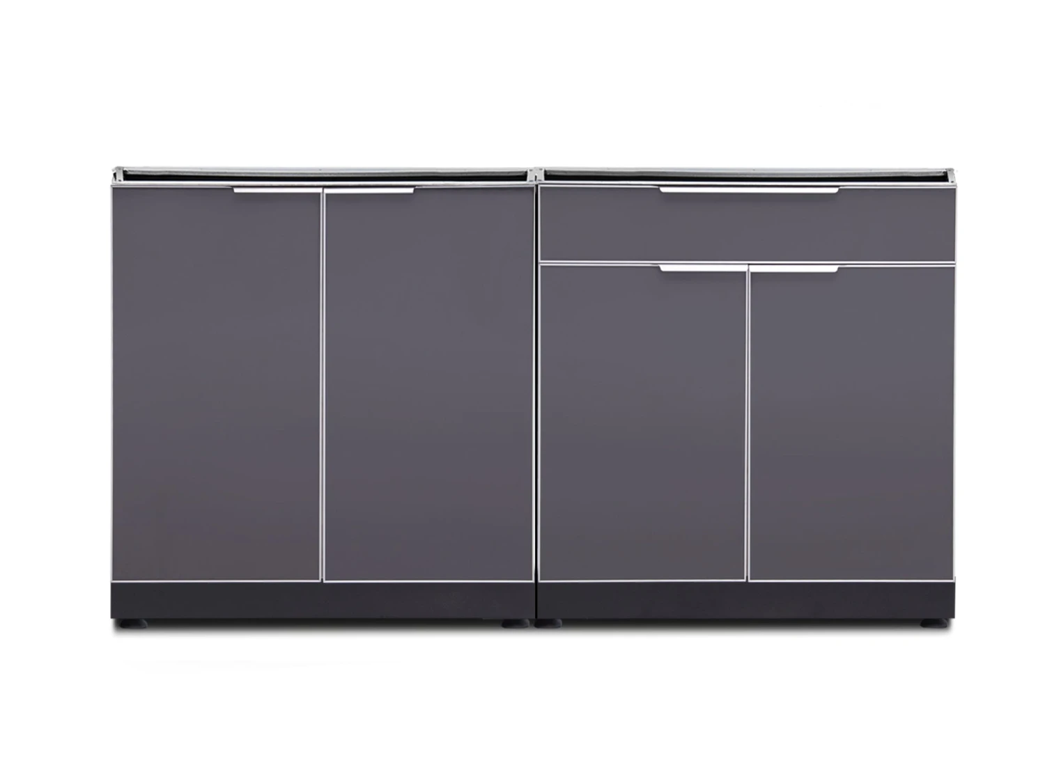 Add modern, functional storage to your exterior living space with Outdoor Kitchen cabinets in Slate Gray. Constructed from aircraft-grade aluminum, these strong and durable cabinets offer plenty of weather-resistant storage to help you get organized. Slate-gray tempered glass doors with integrated handles provide a modern, sleek style that compliments any home, and the height-adjustable levelers keep your cabinets level on uneven decks and patio stones. Adjustable shelves let you customize your 2-Door cabinets to store any sized items, while the Bar Cabinet will keep you organized and help you get the party started. Keep organized and upgrade your backyard living space, with NewAge Products Outdoor Kitchen cabinets in Slate Gray.