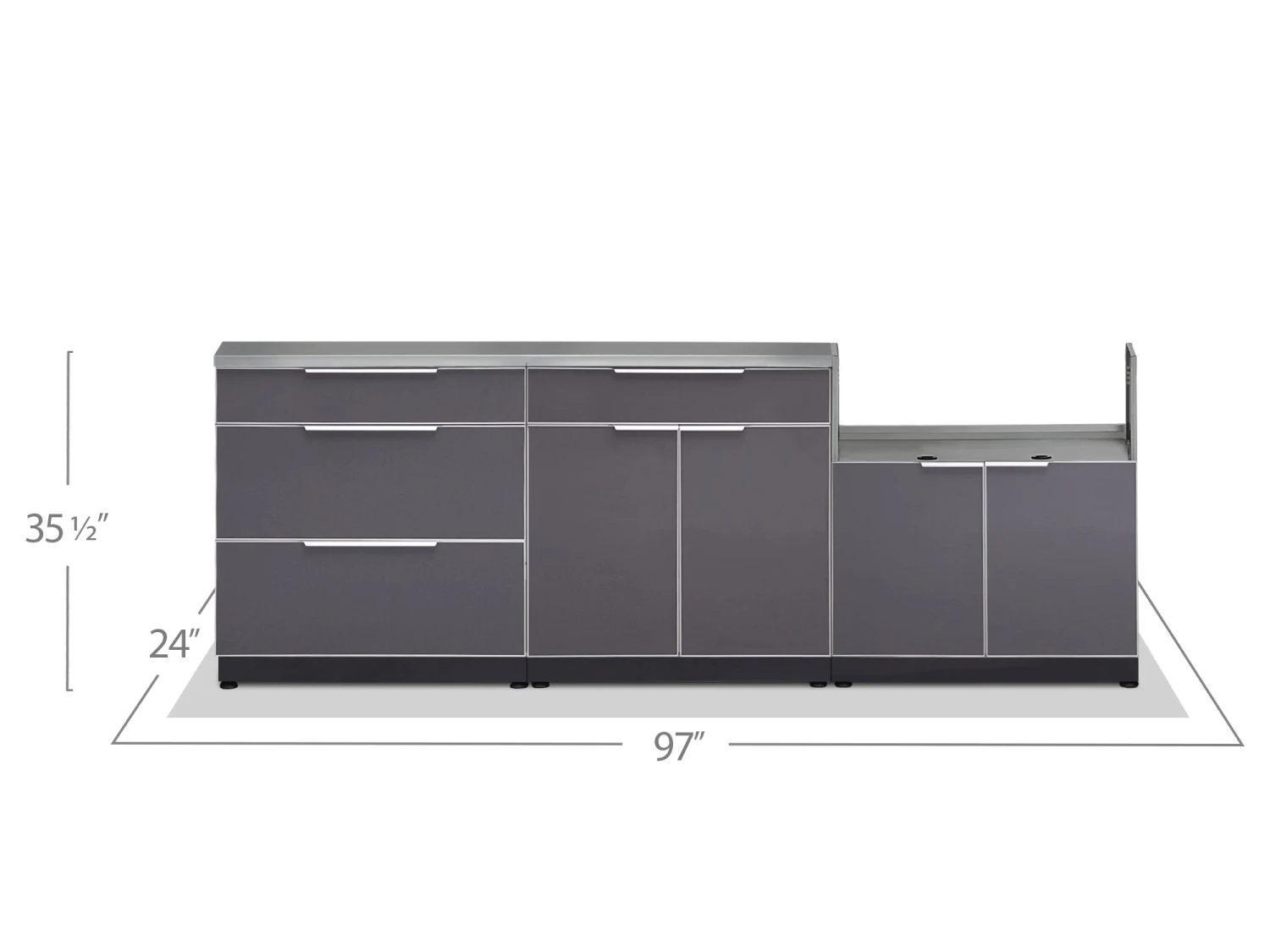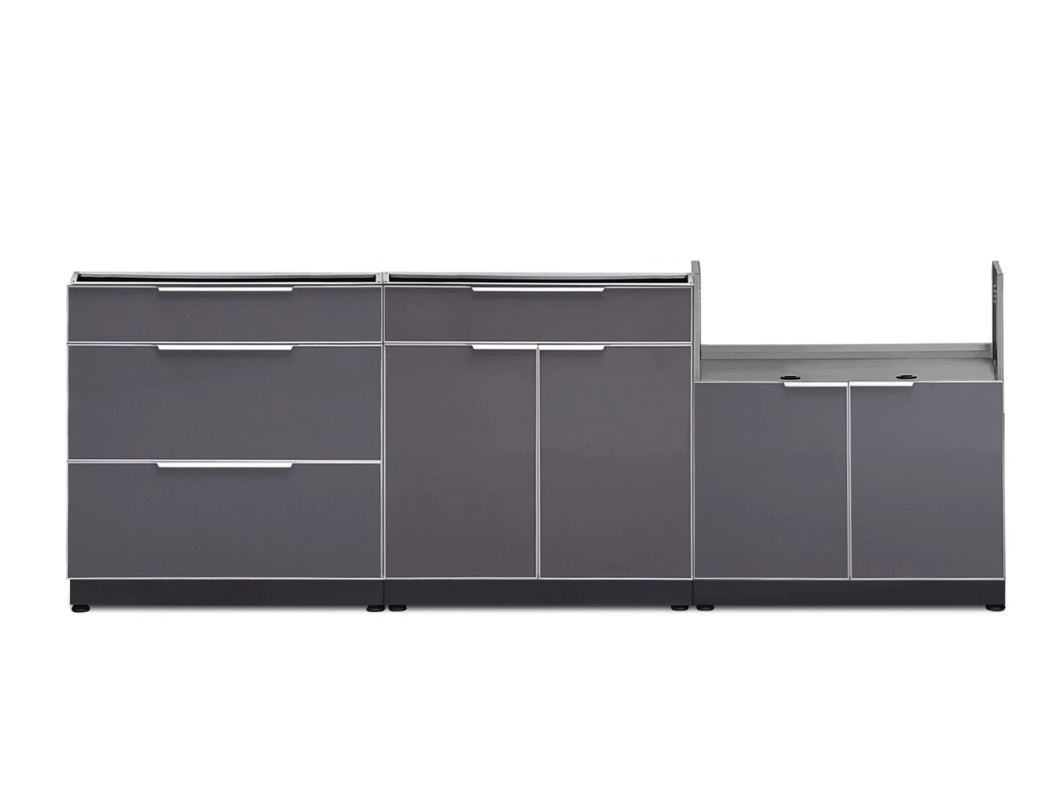 Add modern, functional storage to your exterior living space with Outdoor Kitchen cabinets in Slate Gray. Constructed from aircraft-grade aluminum, these strong and durable cabinets offer plenty of weather-resistant storage to help you get organized. Slate-gray tempered glass doors with integrated handles provide a modern, sleek style that compliments any home, and the height-adjustable levelers keep your cabinets level on uneven decks and patio stones. The 3-Drawer Cabinet has adjustable upper drawer dividers for cutlery and tool organization, with two extra deep drawers, perfect for storing all your hosting essentials. Keep organized and upgrade your backyard living space, with NewAge Products Outdoor Kitchen cabinets in Slate Gray. NewAge Products does not guarantee the compatibility of third party insert grills. Check your grill product manual for compatibility and safety requirements.