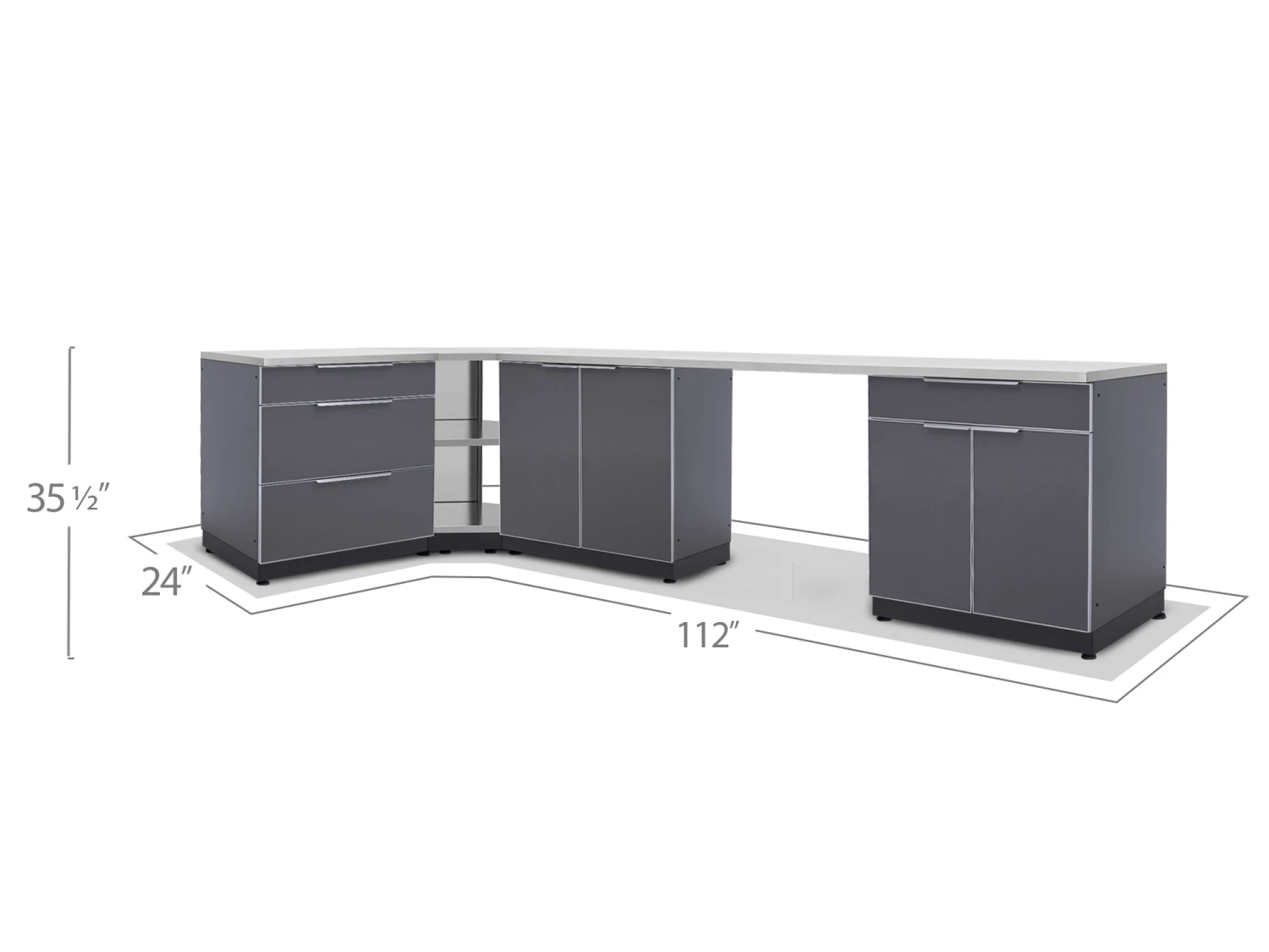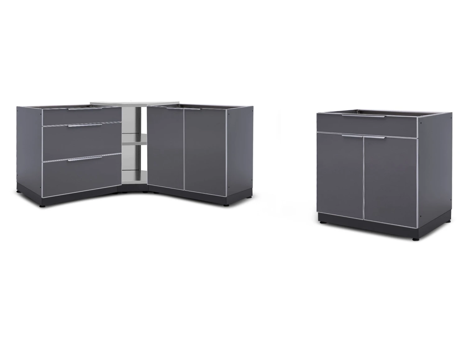 Add modern, functional storage to your exterior living space with Outdoor Kitchen cabinets in Slate Gray. Constructed from aircraft-grade aluminum, these strong and durable cabinets offer plenty of weather-resistant storage to help you get organized. Slate-gray tempered glass doors with integrated handles provide a modern, sleek style that compliments any home, and the height-adjustable levelers keep your cabinets level on uneven decks and patio stones. Adjustable shelves let you customize your 2-Door Cabinet to store any sized items. The 3-Drawer Cabinet has adjustable upper drawer dividers for cutlery and tool organization, with two extra deep drawers, perfect for storing all your hosting essentials. Keep organized and upgrade your backyard living space, with NewAge Products Outdoor Kitchen cabinets in Slate Gray.