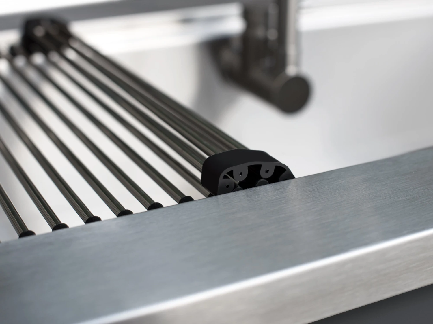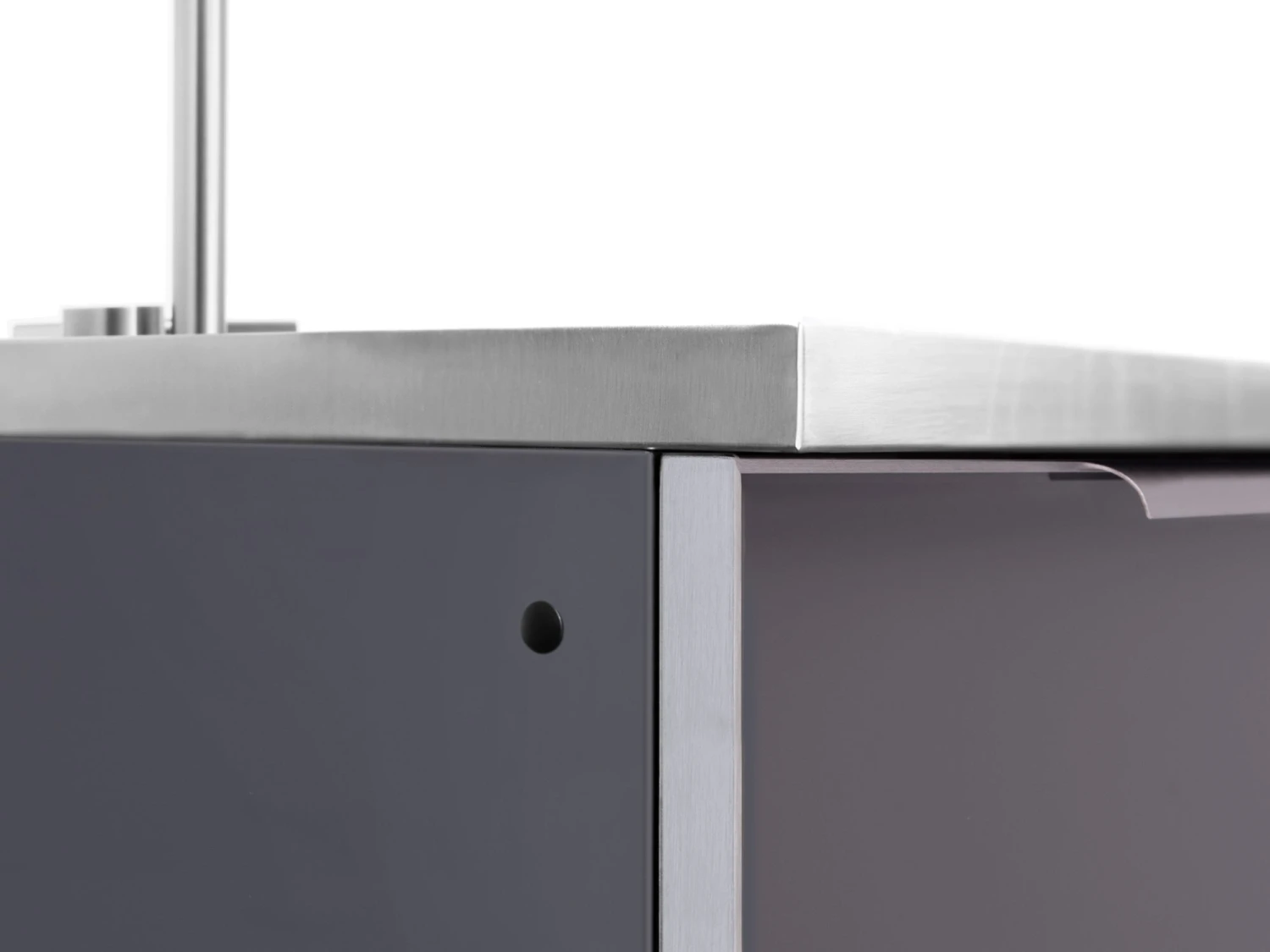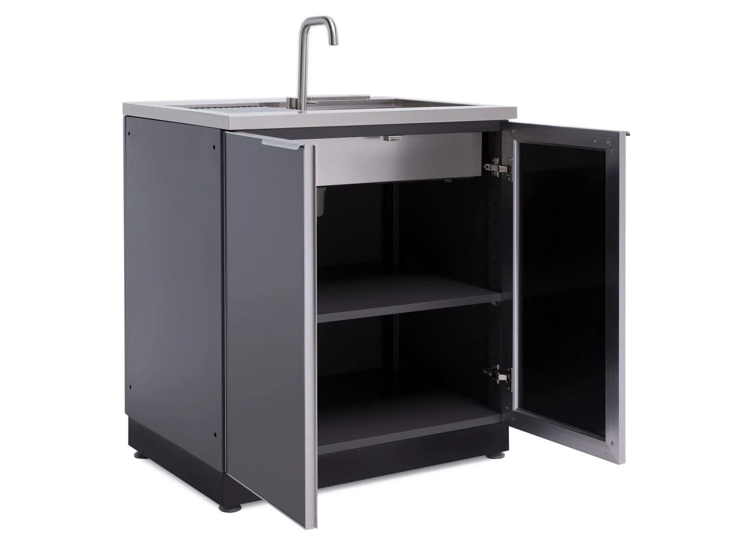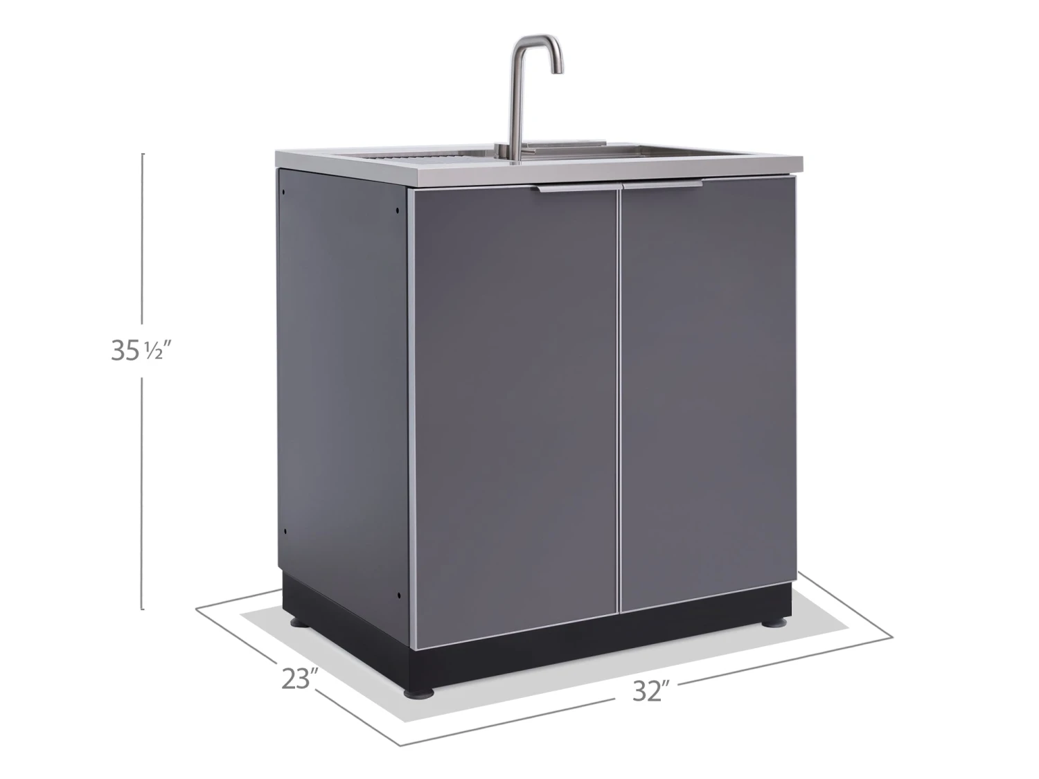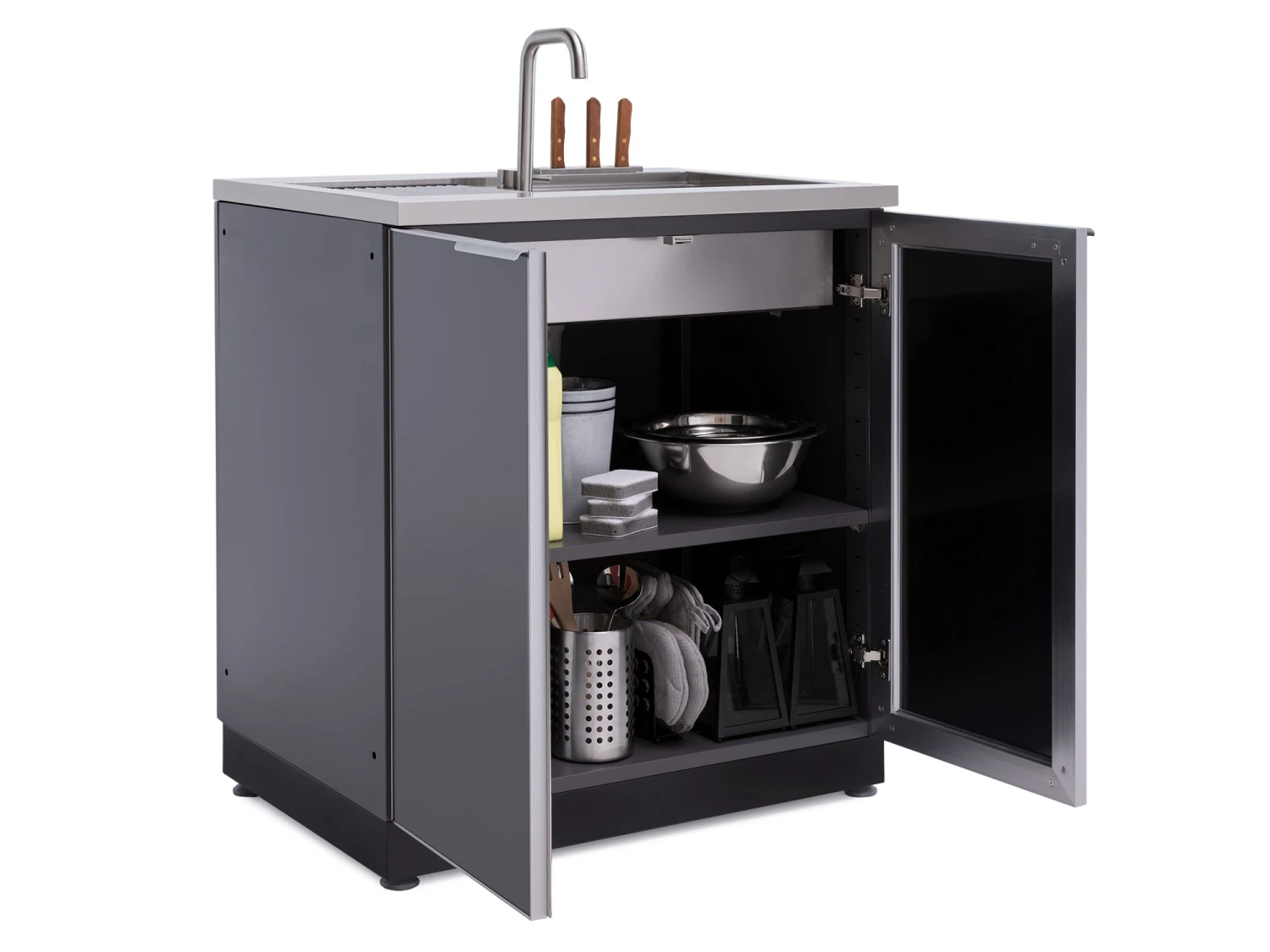 The Outdoor Kitchen Sink Cabinet in Slate Gray provides a convenient clean-up station for muddy hands and dirty dishes. Food prep and after-party cleanup are a breeze with the full width 7 in. deep stainless steel sink basin and fold-down faucet. The aircraft-grade aluminum construction ensures the cabinet is solidly built, with one fixed shelf and plenty of room for clean-up supplies, waste bags, and organic bins. The Sink Cabinet is designed with entertaining in mind, with additions like an extra deep sink basin, integrated knife holder with PVC well, and a roll-up dish drying rack, your dishes will always stay clean. Installation is made easy with pre-punched plumbing ports and braided steel intake hoses for a quick connection to your water supply, while the height-adjustable levelers keep the cabinet level on all surfaces. Convenience and cleanliness, right in your backyard, with the NewAge Products Outdoor Kitchen Sink Cabinet in Slate Gray.