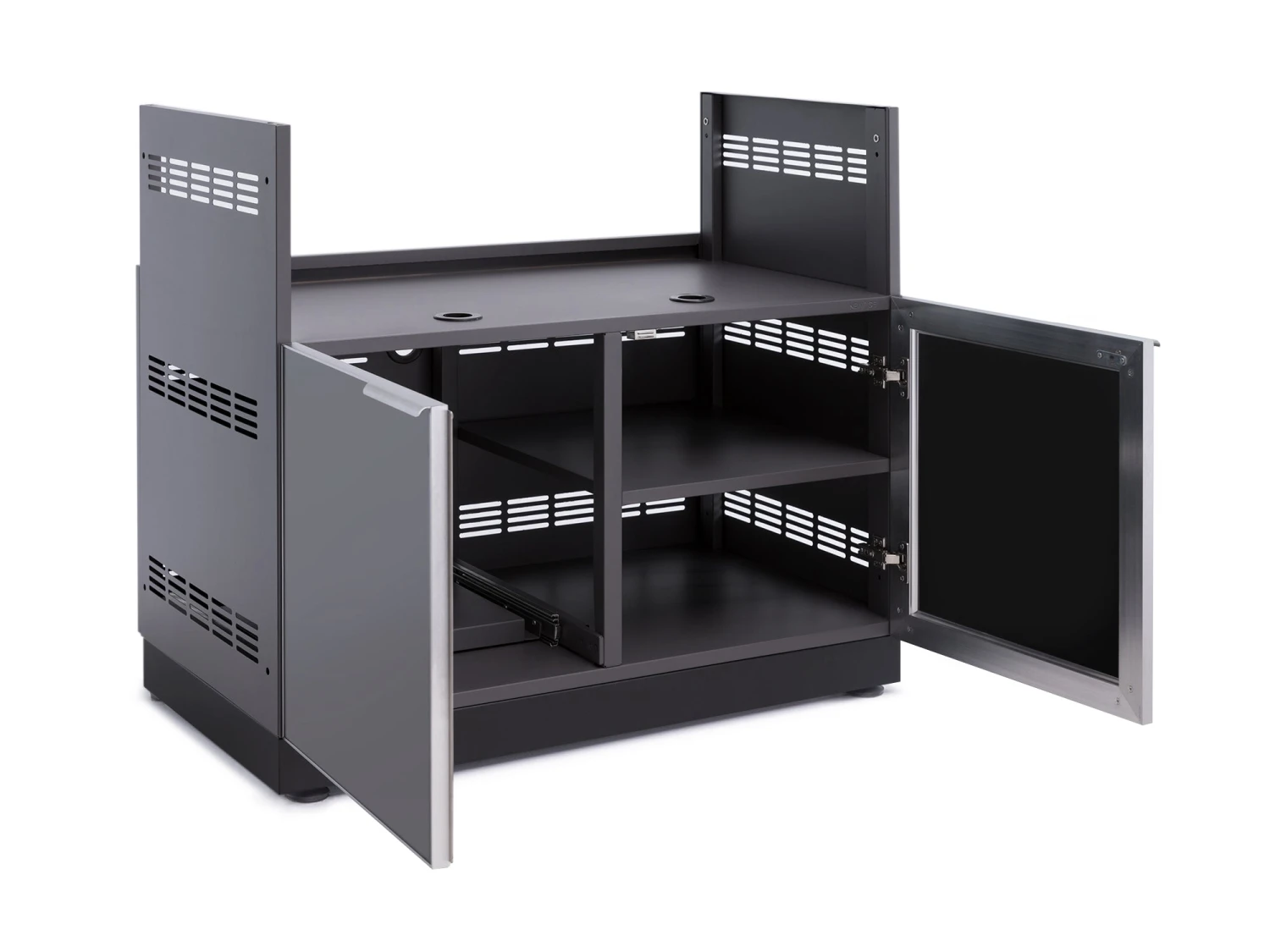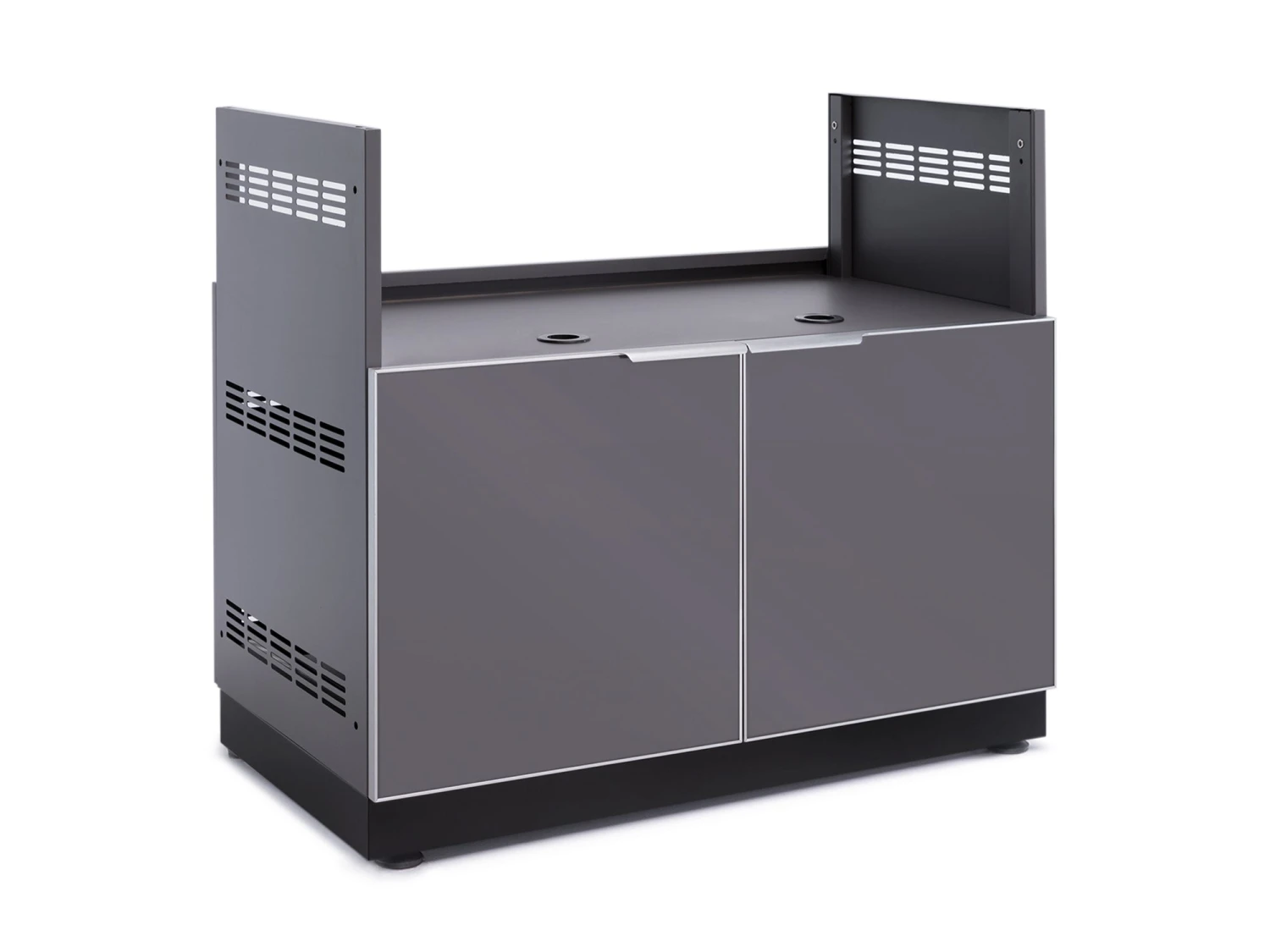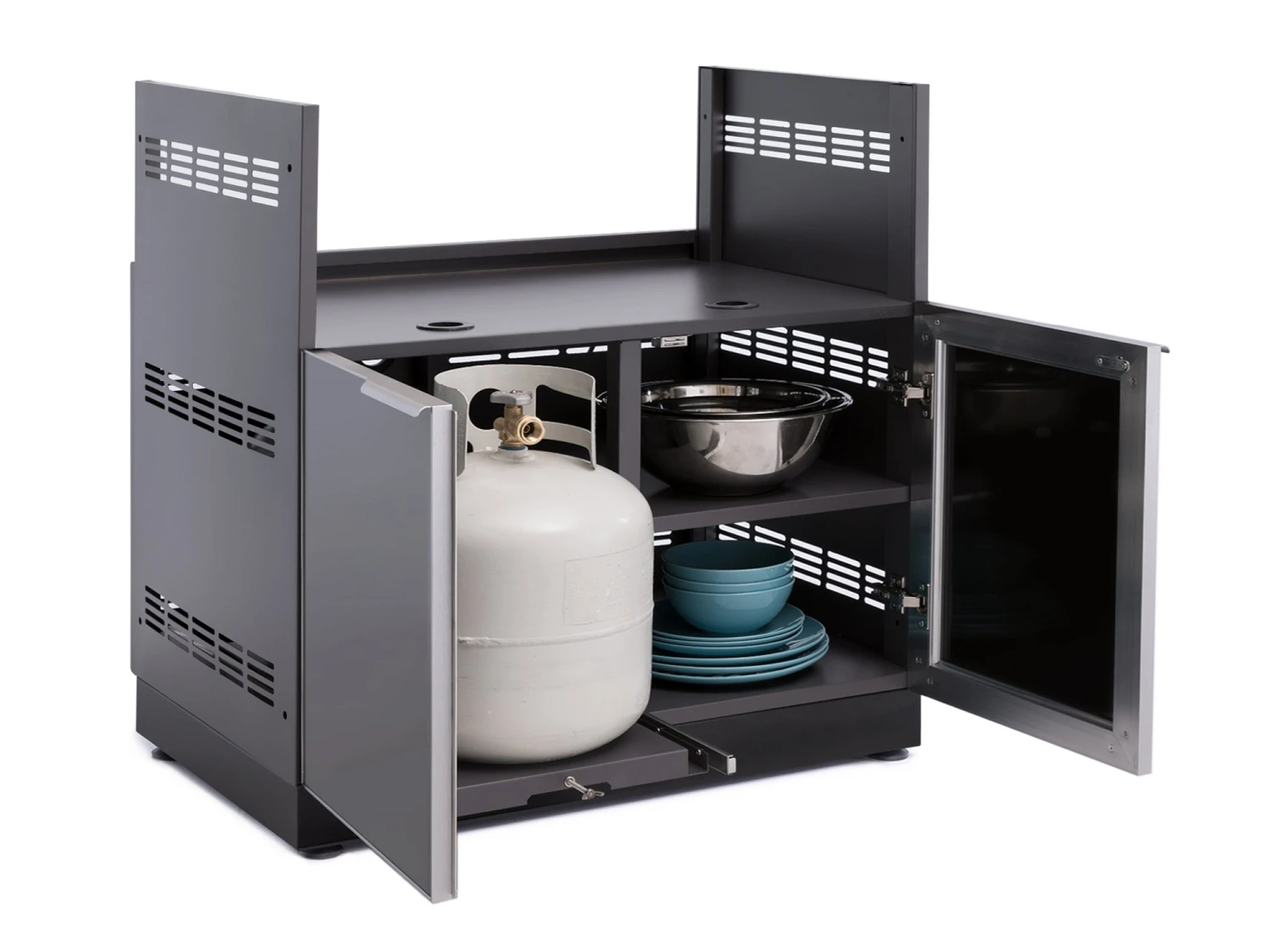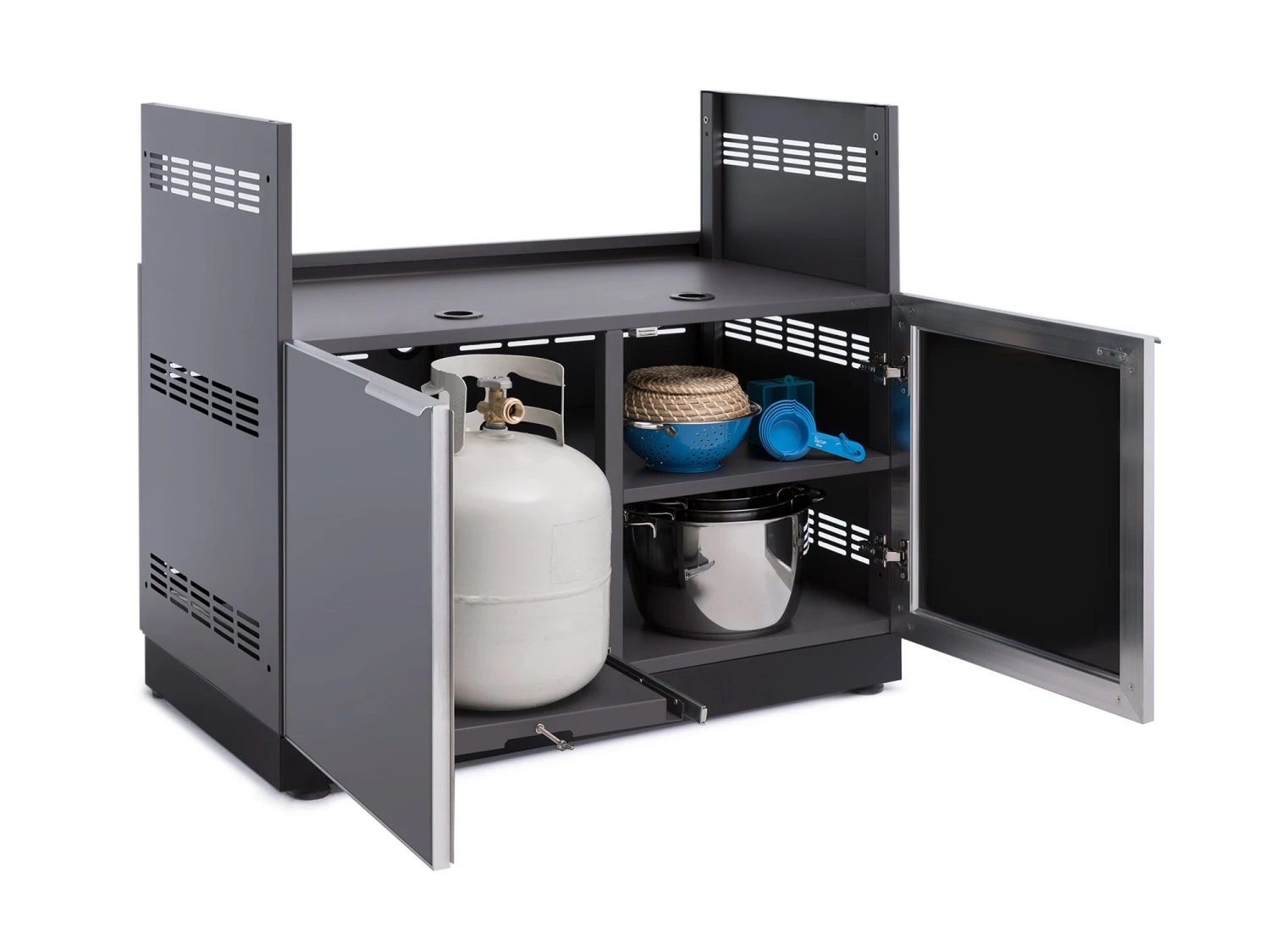 The Outdoor Kitchen Gas Grill Cabinet is ready to upgrade your cooking space with added functionality and storage space. Drop in a compatible 34.5 in. to 40 in. gas grill for 40 in. Grill Cabinet, 28 in. to 33 in. gas grill for 33 in. Grill Cabinet, 31 in. to 36 in. for 26 in Grill Cabinet, and feel what a premium grilling station can offer, with a pull-out propane tank tray with tank lock, and fixed shelf space for storing your cook tools, spices and gloves. NewAge Products does not guarantee the compatibility of third party insert grills. Check your grill product manual for compatibility and safety requirements. The aluminum construction provides the strength needed for supporting heavy-duty grills, with louvered or glass doors on soft-close hinges giving quick access to propane and supplies. Multiple gas line access ports are pre-punched for ease of setup, and the height-adjustable levelers ensure your cabinet and grill is perfectly level. Improve your grilling experience, with the NewAge Products Outdoor Kitchen Gas Grill Cabinet.
