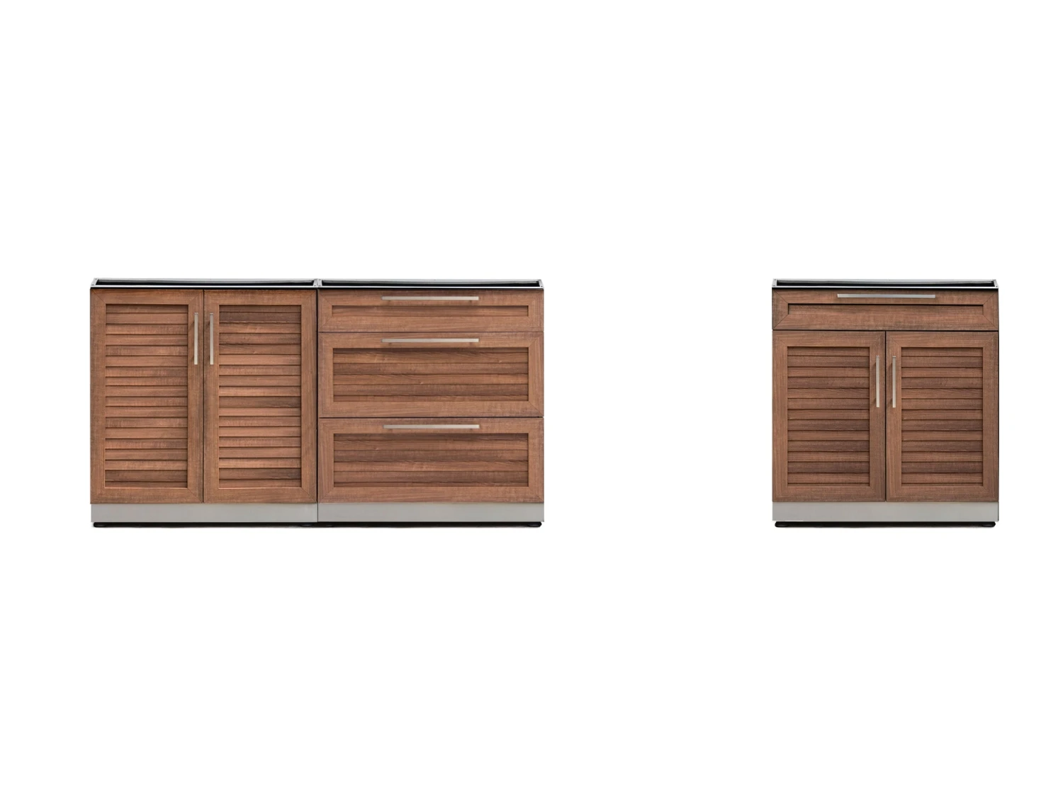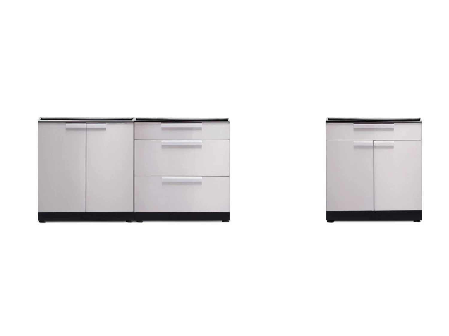 Get grilling, and maximize your backyard storage space, with Outdoor Kitchen cabinets. Constructed from restaurant-grade, with reinforced double-wall doors, these cabinets are weather and corrosion resistant, for all-season durability. Adjustable shelves let you customize your 2-Door Cabinet to store any sized items. The 3-Drawer Cabinet has adjustable upper drawer dividers for cutlery and tool organization, with two extra deep drawers, perfect for storing all your hosting essentials. With brushed doors and beveled aluminum handles, the NewAge Products Outdoor Kitchen cabinets provide a clean, professional look that will get your backyard organized.