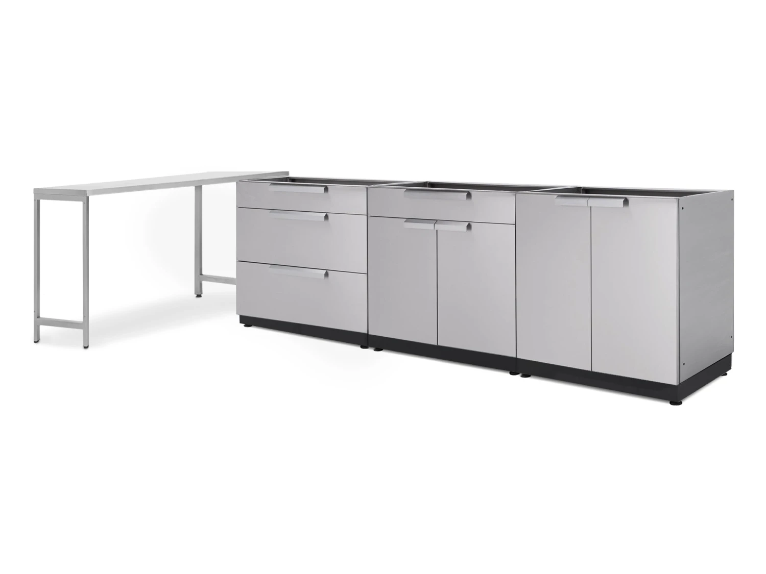 Get grilling, and maximize your backyard storage space, with Outdoor Kitchen cabinets. Constructed from restaurant-grade, 304 stainless steel, with reinforced double-wall doors, these cabinets are weather and corrosion resistant, for all-season durability. Adjustable shelves let you customize your 2-Door Cabinet to store any sized items. The 3-Drawer Cabinet has adjustable upper drawer dividers for cutlery and tool organization, with two extra deep drawers, perfect for storing all your hosting essentials. With brushed doors and beveled aluminum handles, the NewAge Products Outdoor Kitchen cabinets provide a clean, professional look that will get your backyard organized.
