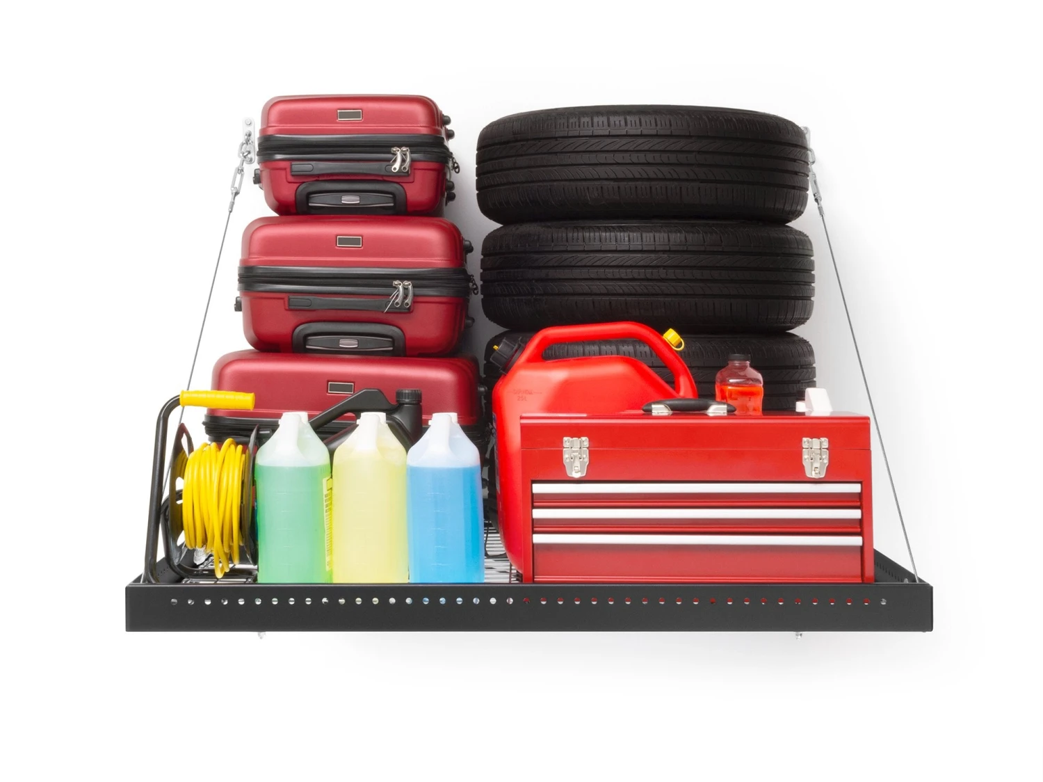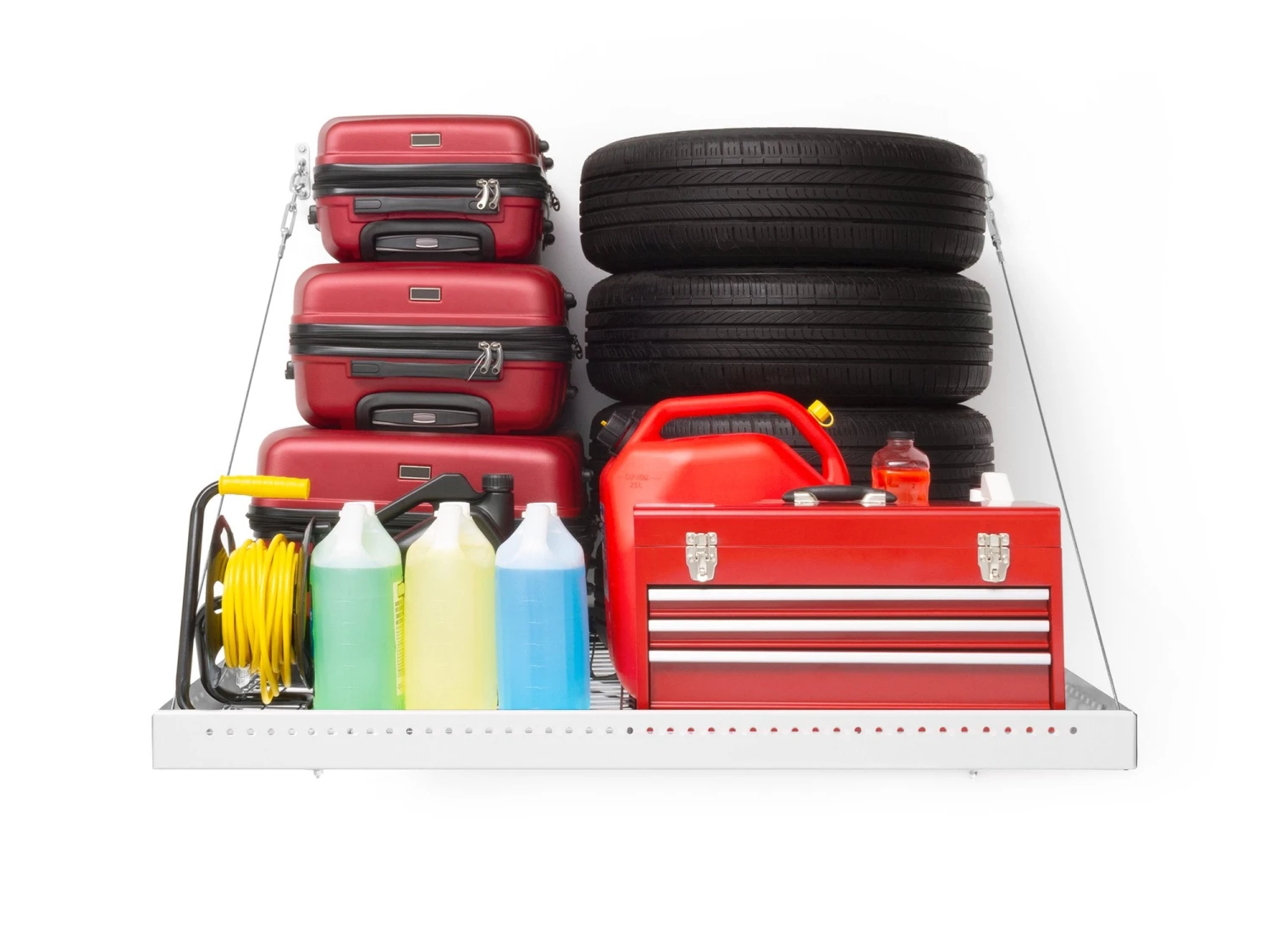 - 16 square feet of elevated storage to clear your garage floor space