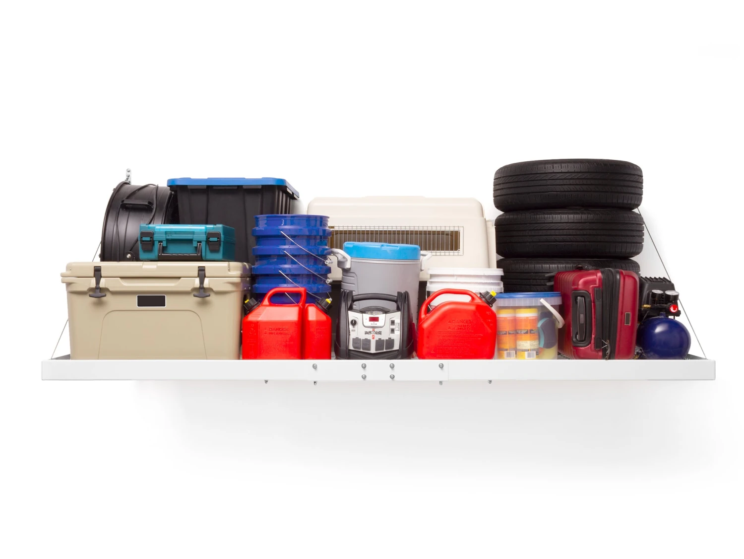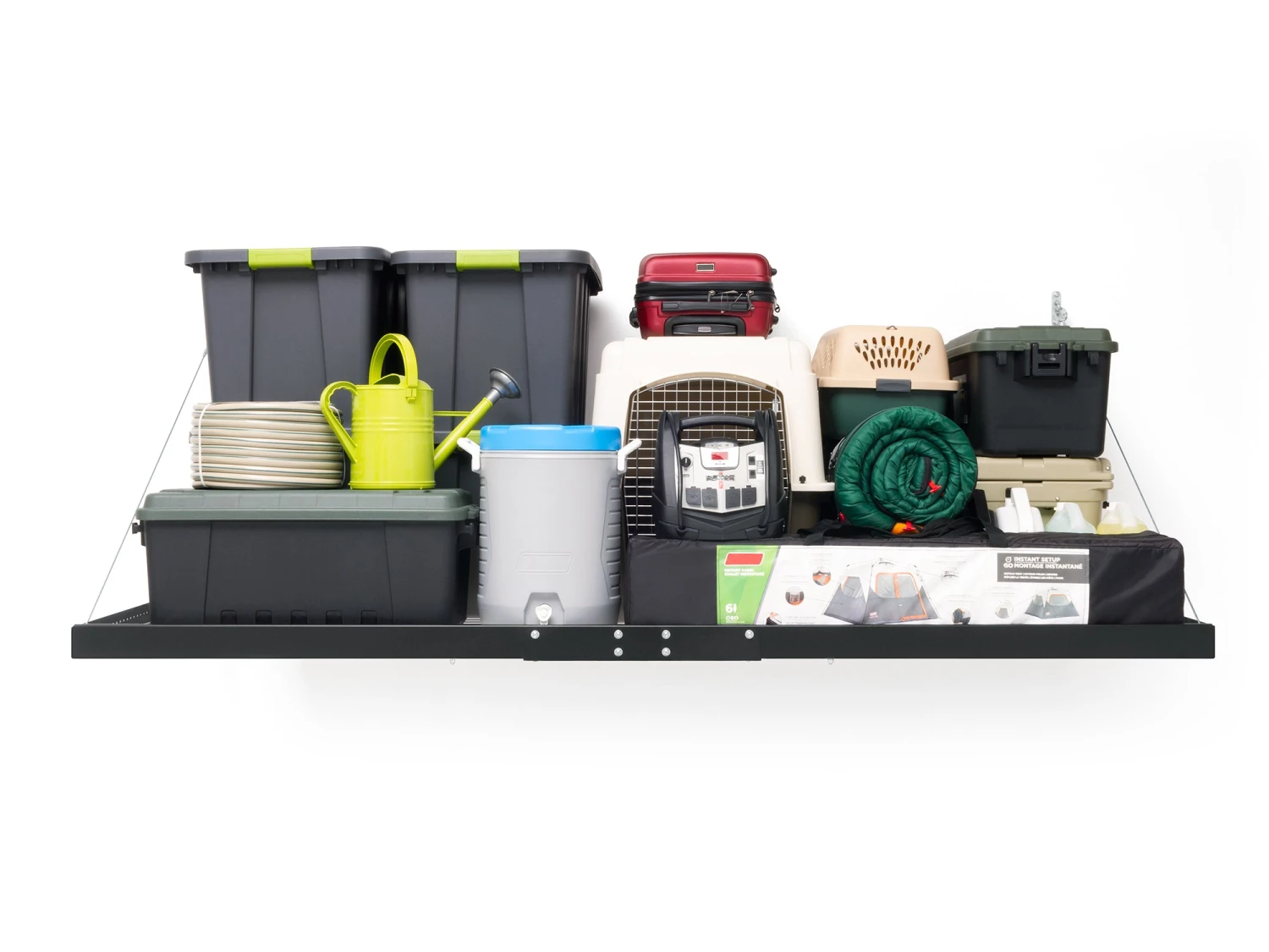 Keep organized, and maximize overhead storage space in your garage with the NewAge Products Pro Series Wall Mounted Steel Shelves. The 4 ft. x 8 ft. Pro Series Shelf gives you 32 square foot area for holding luggage, camping gear, and other bulky items you need cleared from your garage floor. Stack multiple shelves, connect them side-by-side, build around corners, install tight to the ceiling or mid-wall; there’s no wrong way to use this storage system. Our Aircraft-Grade steel support cables are tested to 1,000 lbs. for a safe solution that’s adjustable to your stud spacing. The heavily engineered frame is constructed from thick gauge steel and a C-Shaped front perimeter beam, for a shelf that easily supports loads up to 600 lbs. The steel wire decks drop securely into the cross beam supports for even weight distribution, and a 1.25 inch perimeter safety lip prevents items from sliding off the edge. Big storage, customized to your space, with the Pro Series Wall Mounted Steel Shelves.