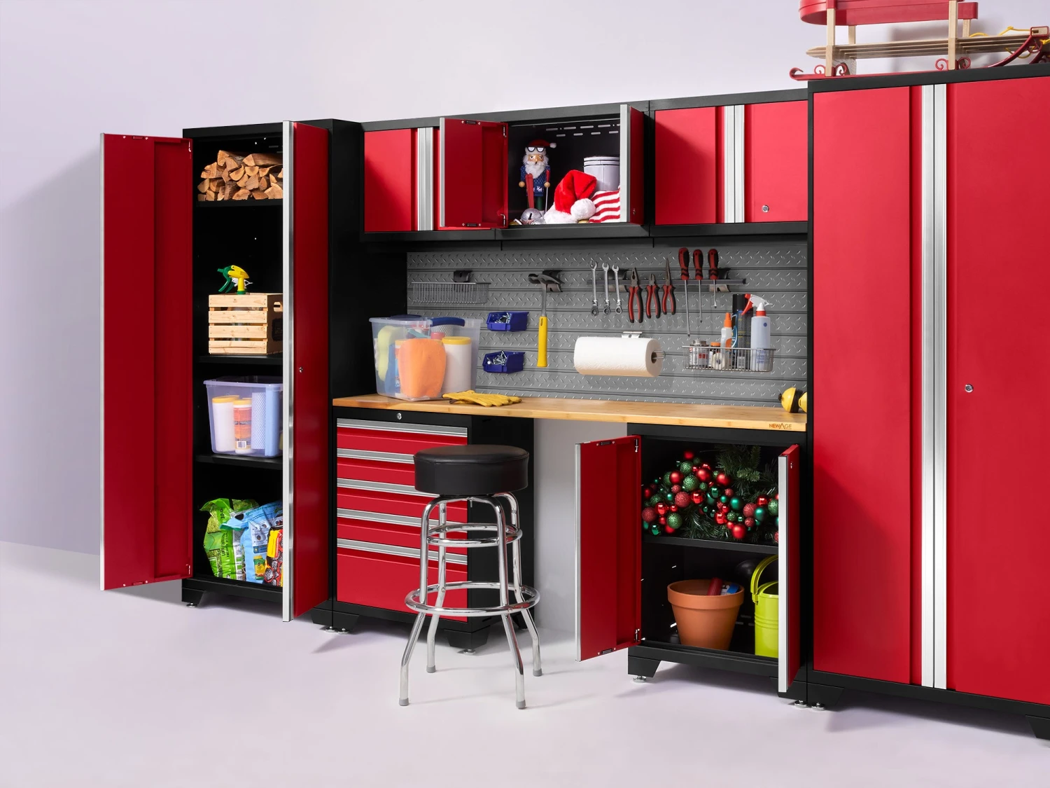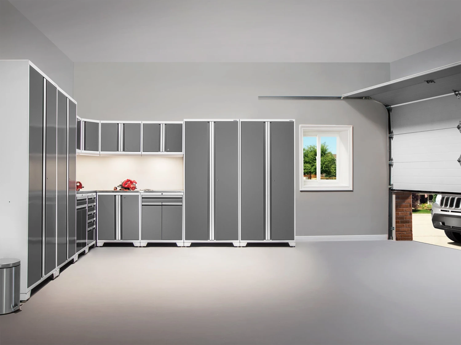 Get more out of your garage with NewAge Products Pro Series collection of storage solutions, engineered for strength, and designed with the premium features and modern look of a garage showroom. Our Pro Series Cabinets are built with heavy-duty steel frames, double-walled doors, and adjustable shelving and leveling legs, for a premium storage configuration that adapts to your space and needs. Integrated full-length handles offer a clean, space-saving design for the lockable doors, while soft-close hinges and extra-strong ball bearing drawer slides give easy access to your tools and gear. NewAge Products Pro Series collection is the ideal all-in-one solution to your garage organization needs.