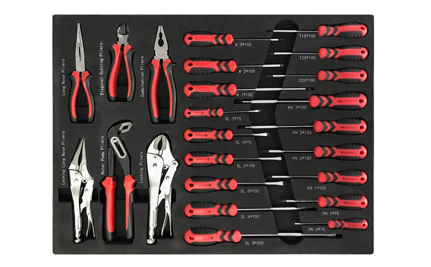 Custom fit for Pro 3.0 and Performance Plus 2.0 Series Tool Cabinets, the Screwdriver and Plier Trays include 24 professional tools that are both strong and corrosion resistant. With precision cut-outs and easy-to-read labels this set includes everything you need to get the job done.