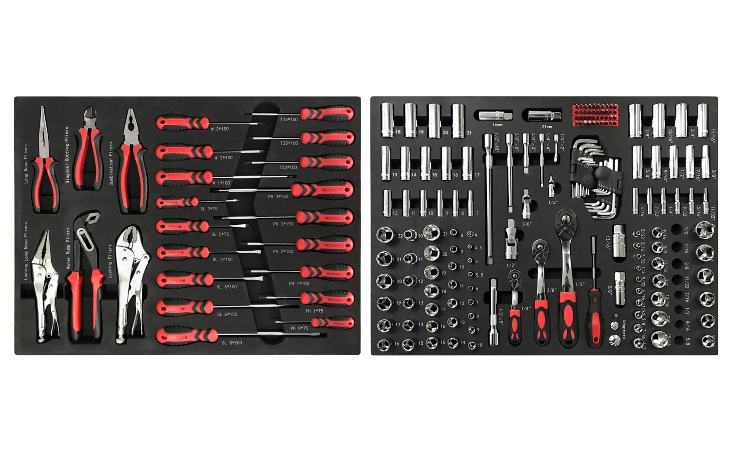 Custom fit for your Pro 3.0 and Performance Plus 2.0 Series Tool Cabinets, the Socket Set and Screwdriver Plier Tray, includes screwdrivers, pliers and everything you need for your next project. Crafted from chromium-vanadium steel for durability and corrosion resistance, these tools are placed in a custom-cut EVA tray so you will never loose them.