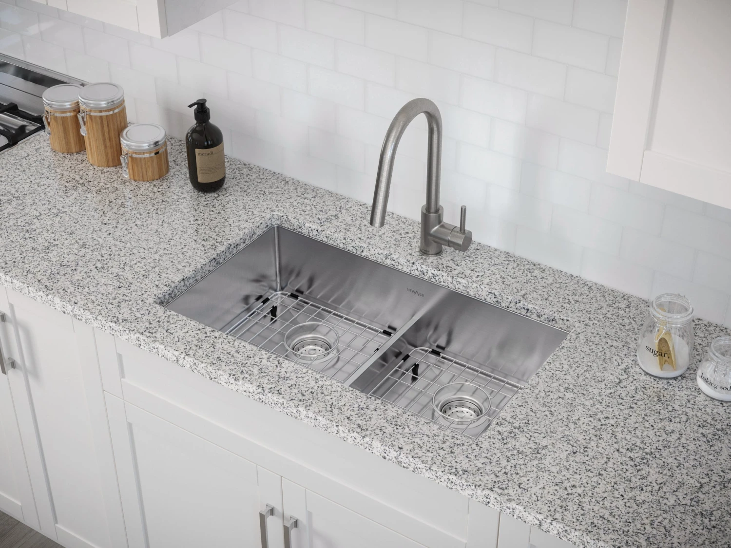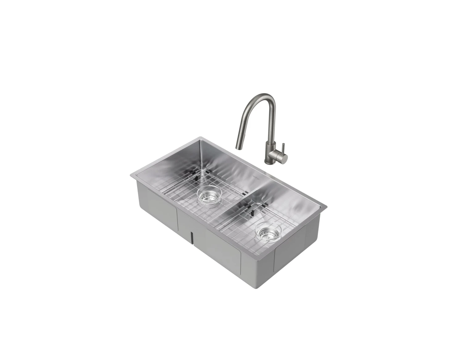 With its sleek contemporary style, our 30.35 in. Undermount Double Bowl Sink is effortlessly versatile, coordinating seamlessly with almost any style of home décor. Designed for easy installation, it simply drops down into your cabinet. The sleek, undermount profile lets you brush crumbs and wipe spills directly into the sink. Integrated sound dampening helps make clean up more pleasant, while the premium 18 gauge 304 stainless steel construction ensures outstanding corrosion resistance and years of easy-clean performance. This comes with a sink grid included for added protection. The Classic Pull-Down Faucet provides optimal control, with an easy-to-use retracting hose extension. The swivel spout that rotates 360 degrees and makes light work of hard-to-clean dishes with a maximum flow rate of 1.8 gallons per minute. The ceramic disc cartridge prevents leaks when the faucet is turned off, while single lever operation provides precision temperature control. Made from lead-free brass, this faucet is low maintenance and easy to wipe clean after use. Available in your choice of a brushed nickel or chrome finish, the contemporary arched design is a showpiece for any kitchen. Enjoy it in your home with the confidence of a limited lifetime warranty.