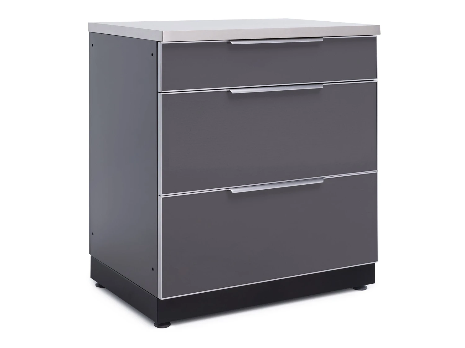 The Outdoor Kitchen 3-Drawer Cabinet gives you the convenient storage space you need for organizing hosting supplies, games and toys, and serving utensils. The fully assembled cabinet is built with aircraft-grade aluminum for supporting heavy weights, and can easily handle stacks of dishes, bags of charcoal for grilling, and anything else you can throw at it. Two extra deep drawers, on soft-close drawer slides, smoothly open to full-extension for completely accessible space, and easy-grip handles provide quick drawer access even when your hands are full. The top drawer includes adjustable stainless steel dividers for separating cutlery and utensils, and easily organizing small items like skewers and BBQ lighters. For the convenience of a stocked kitchen, right in your backyard, the NewAge Products 3-Drawer Cabinet is your ultimate storage solution.