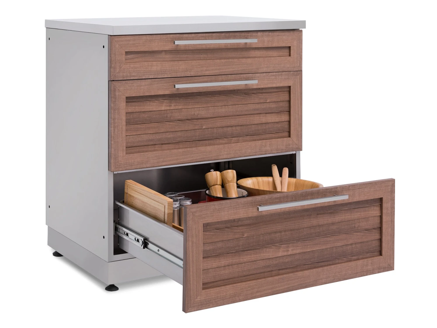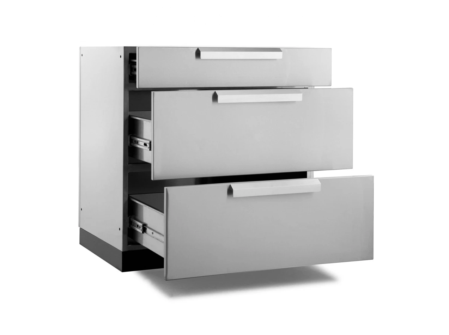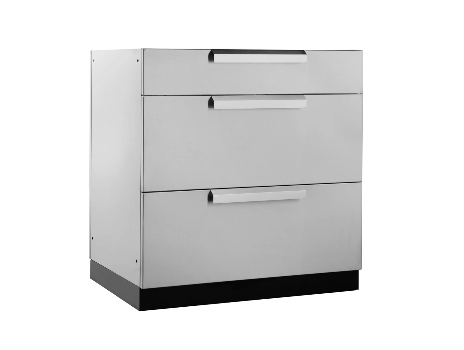 The Outdoor Kitchen 3-Drawer Cabinet gives you the convenient storage space you need for organizing hosting supplies, games and toys, and serving utensils. The fully assembled cabinet is built with 304 stainless steel for supporting heavy weights, and can easily handle stacks of dishes, bags of charcoal for grilling, and anything else you can throw at it. Two extra deep drawers, on soft-close drawer slides, smoothly open to full-extension for completely accessible space, and easy-grip handles provide quick drawer access even when your hands are full. The top drawer includes adjustable stainless steel dividers for separating cutlery and utensils, and easily organizing small items like skewers and BBQ lighters. For the convenience of a stocked kitchen, right in your backyard, the NewAge Products 3-Drawer Cabinet is your ultimate storage solution.
