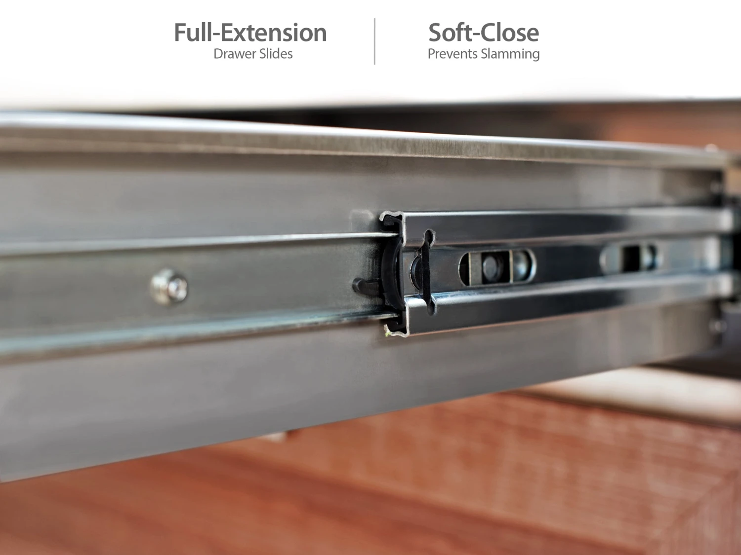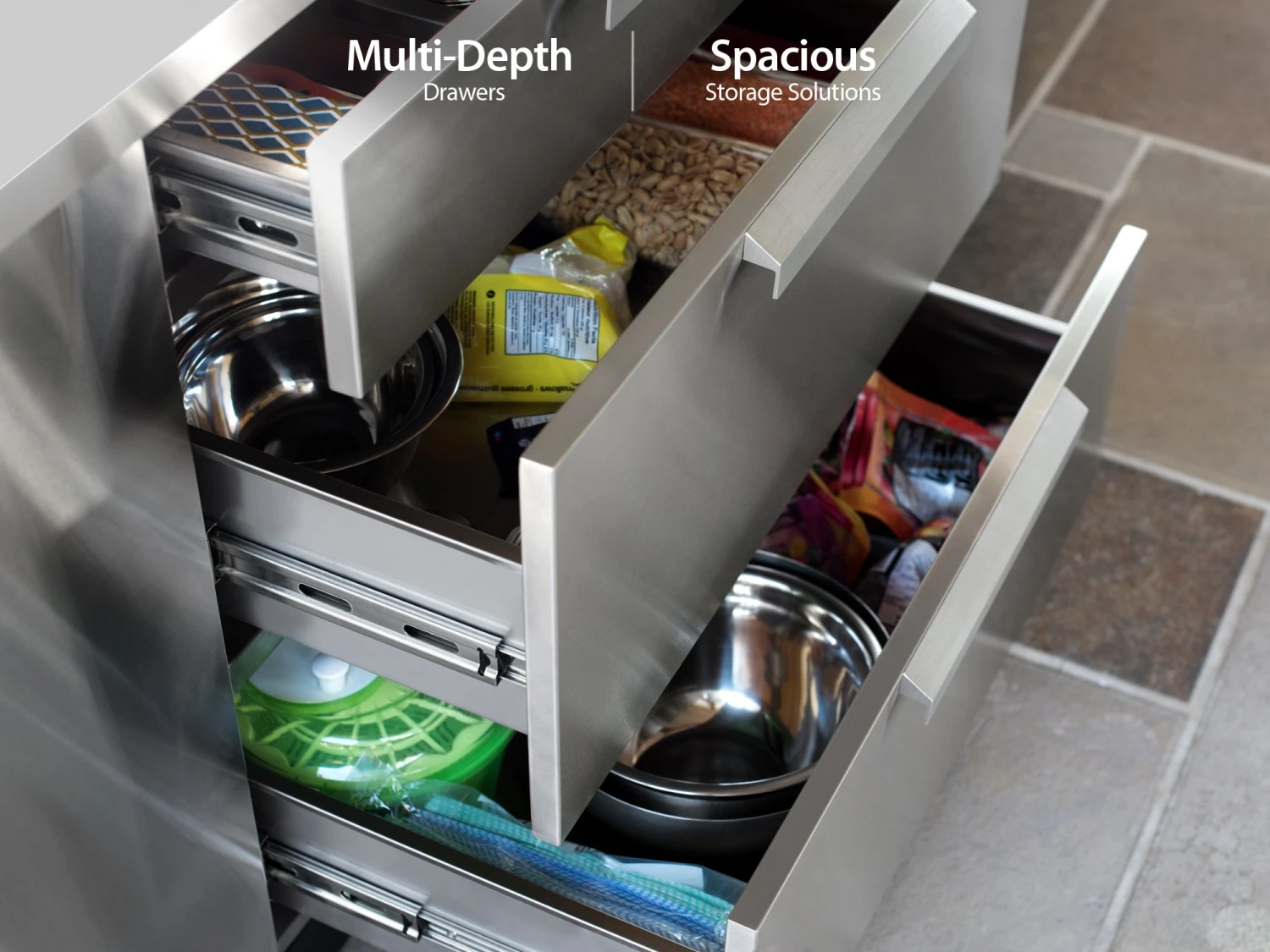 - Full extension multi-depth drawers offer storage for items of different sizes