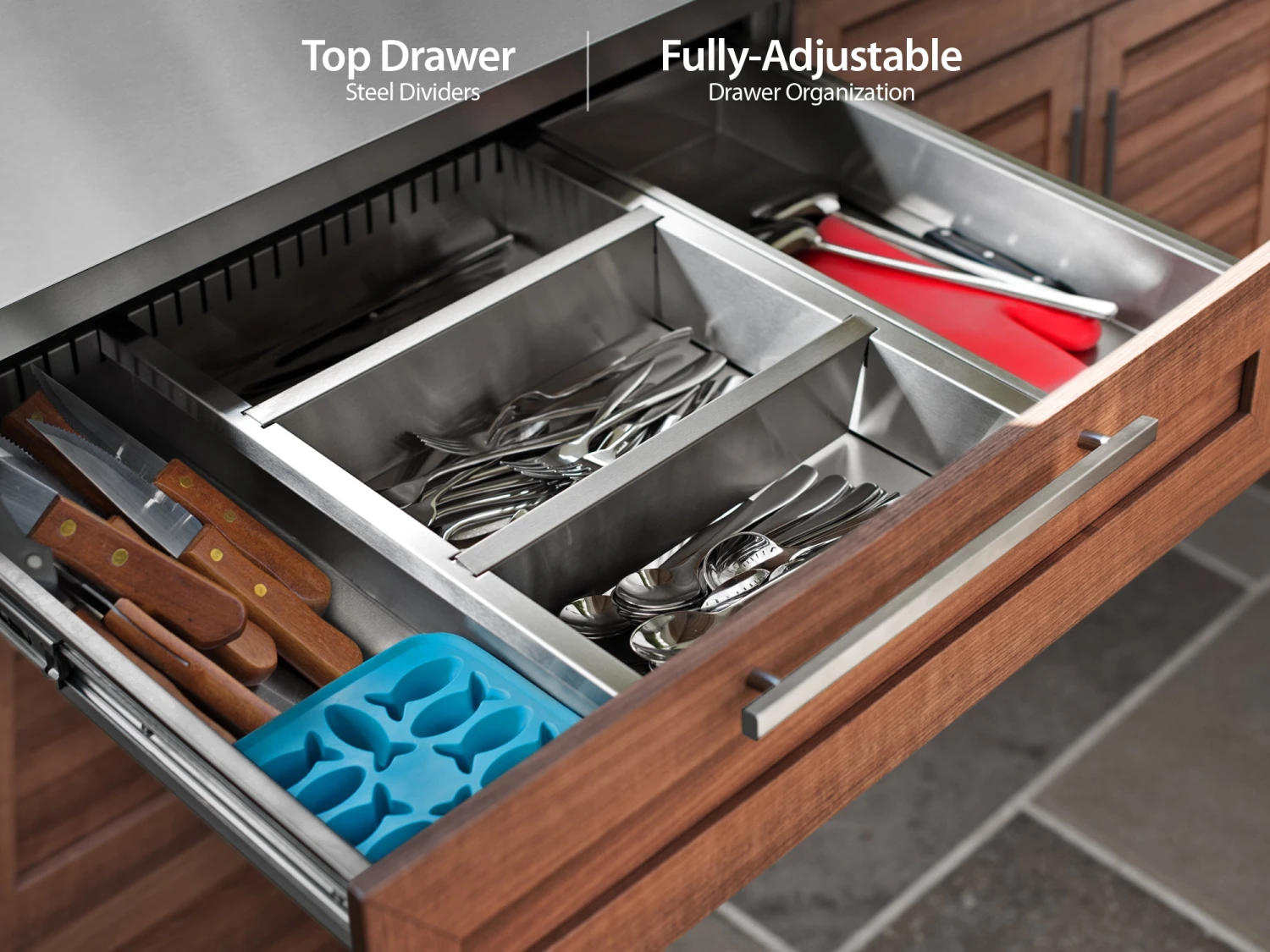 - Adjustable upper-drawer dividers help to organize items