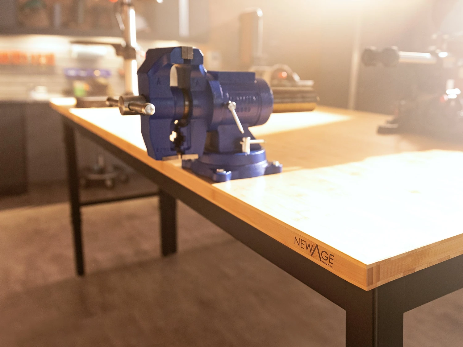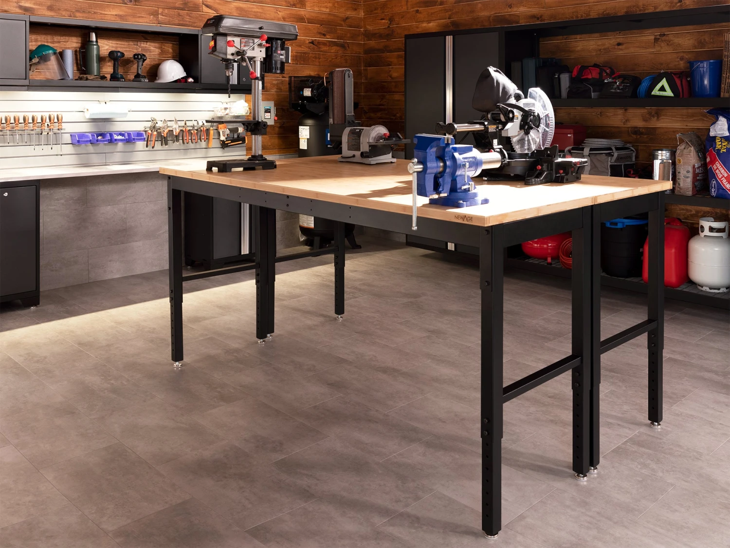 Create the perfect project workstation for your garage with the Pro 66 in. Workbench. The heavy-duty steel Workbench is built tough, to handle any project. The Workbench has an impressive weight capacity of 2,000 lbs.; giving you a rock-solid surface to support your tools, building materials, and everything you need to get the job done right. Every project is unique, and you need a workspace that can adjust to meet your needs. The height-adjustable legs allow you to set the optimal frame height for comfortable work sessions, with adjustable leveling legs that provide a perfectly level work surface on uneven garage floors. Set up your NewAge Products Workbench against the wall for a perimeter work area, or seamlessly integrated into your Pro or Bold Series cabinet set with its color-matched frames. For projects that require 360-degree access, the Workbench can be easily maneuvered to your desired work area. Built tough for any project, the Pro 66 in. Workbench is the essential workstation for your garage.